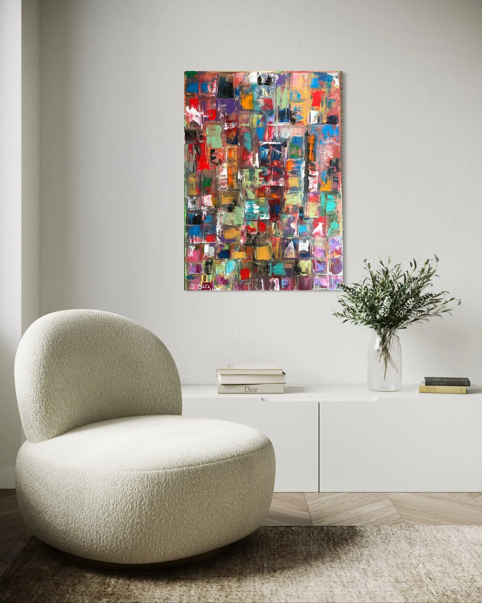 Abstraktes Gemälde mit rechteckigen Farbflächen in kräftigen Rot-, Blau-, Grün- und Gelbtönen; lebendige, strukturierte Acrylmalerei im Hochformat, ideal als moderner Wandschmuck für Wohn- und Büroräume.