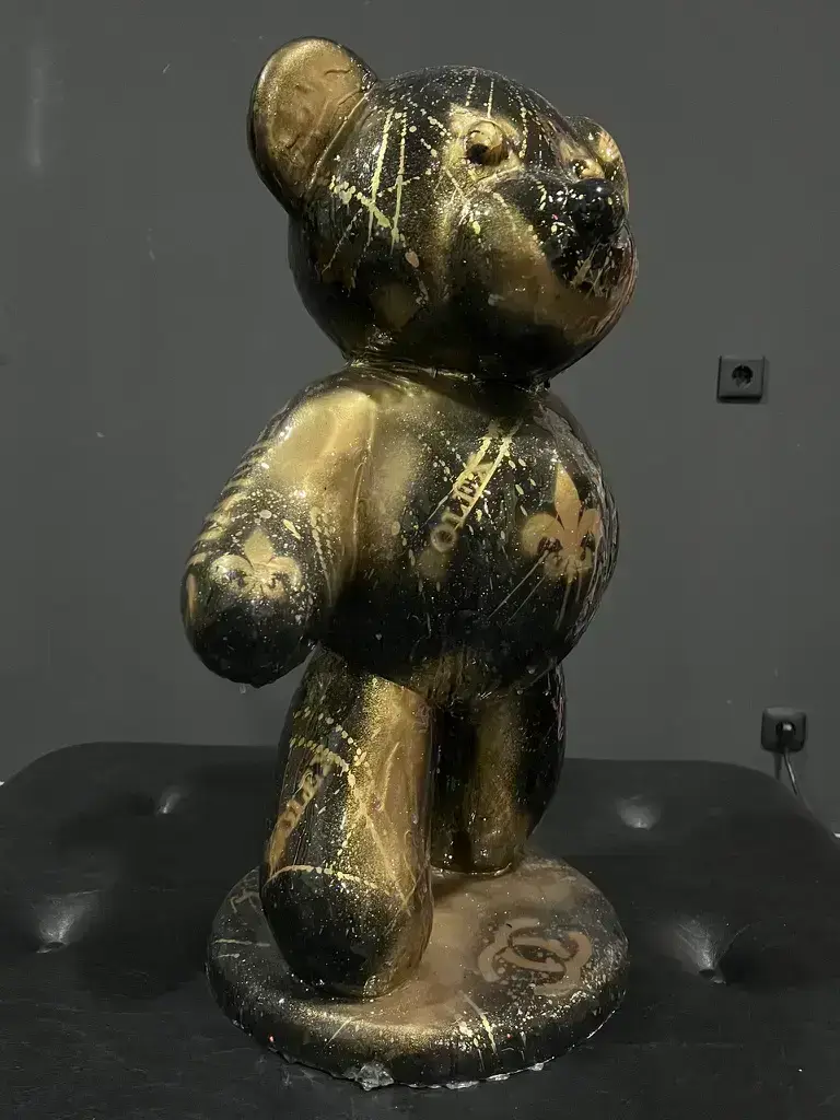 Diese luxuriöse Teddy-Skulptur vereint dunkle Eleganz mit markanter Urban-Art-Ästhetik. Schwarz-goldene Farbschichten, Drip-Effekte und ikonische Markensymbole verleihen dem Werk eine kraftvolle, fast majestätische Ausstrahlung. Durch das transparente Epoxidharz-Finish entsteht ein hochglänzender, tiefenwirksamer Look, der Street-Culture und High-End-Art nahtlos verbindet. Ein ausdrucksstarkes Sammlerobjekt für anspruchsvolle Kunstliebhaber, die Luxus neu definieren