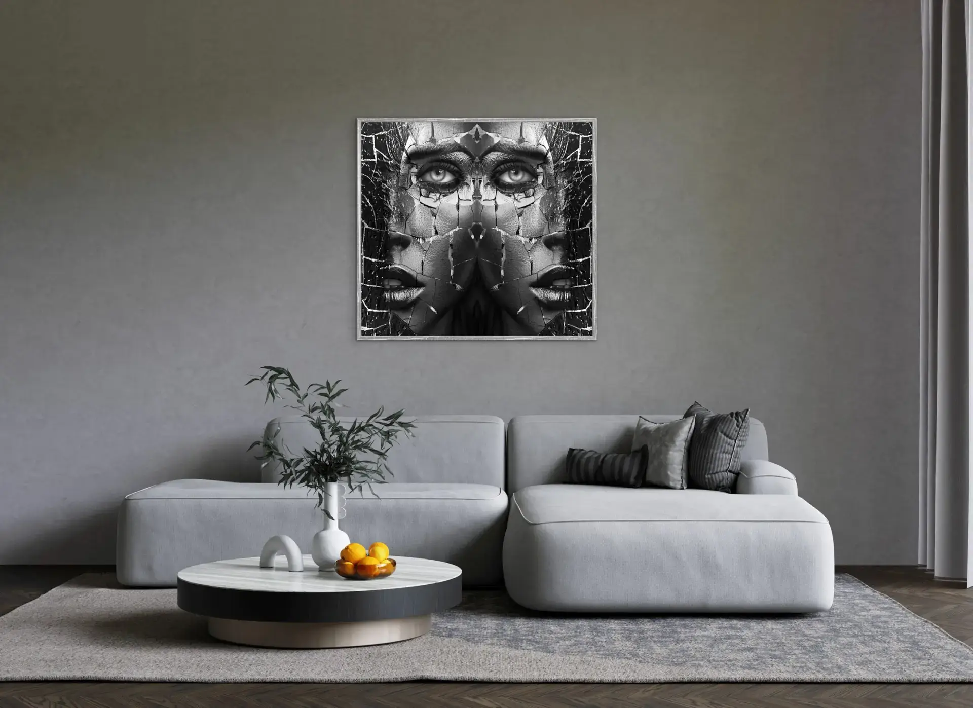 Fotodirektdruck auf weißer Alu-Dibond Platte 3 mm in einem Schattenfugen Rahmen. Dieser wurde individuell mit unterschiedlichen Silbertönen besprüht. Die Maße dieses Kunstwerkes sind 1m x 1m.