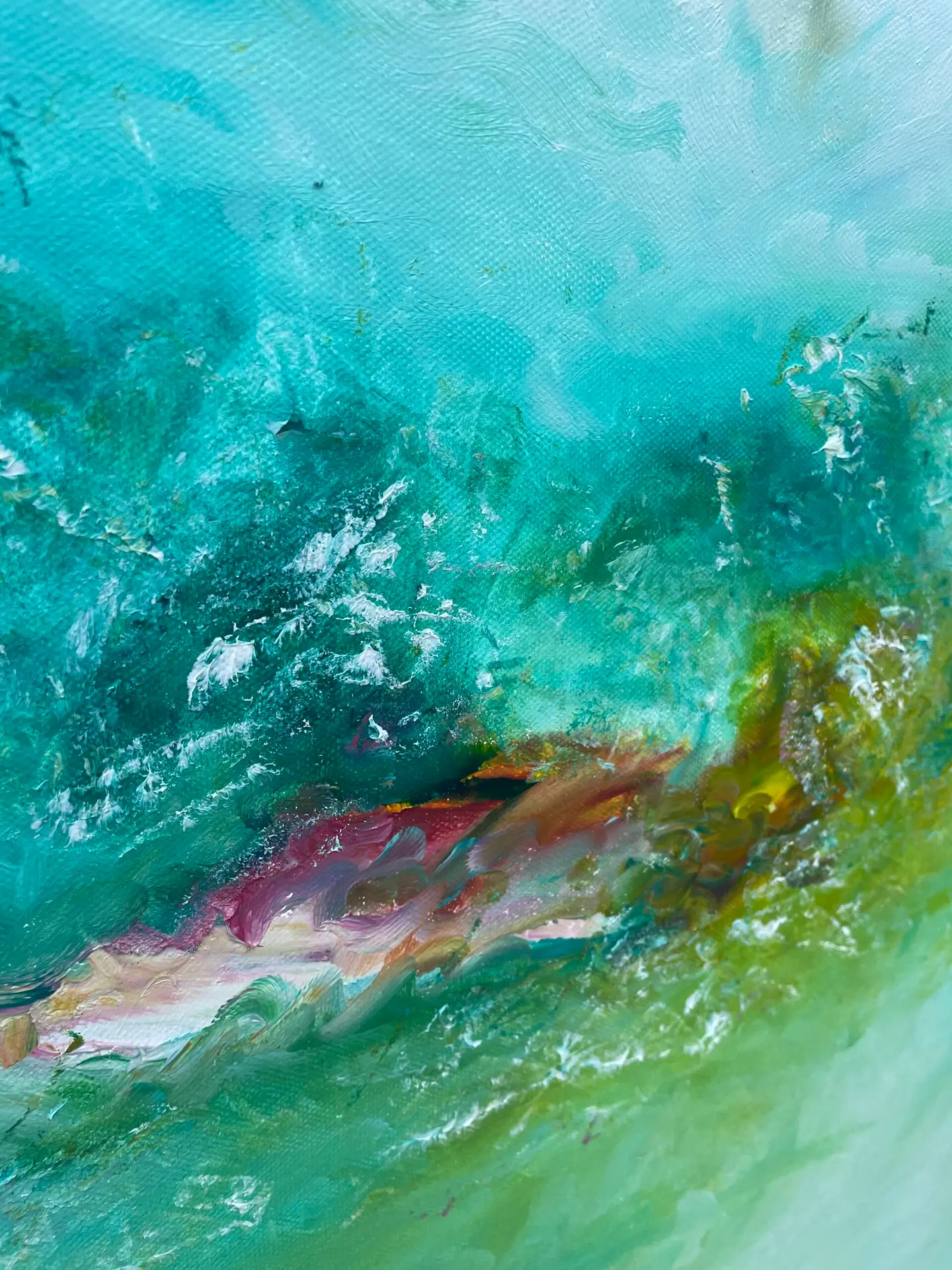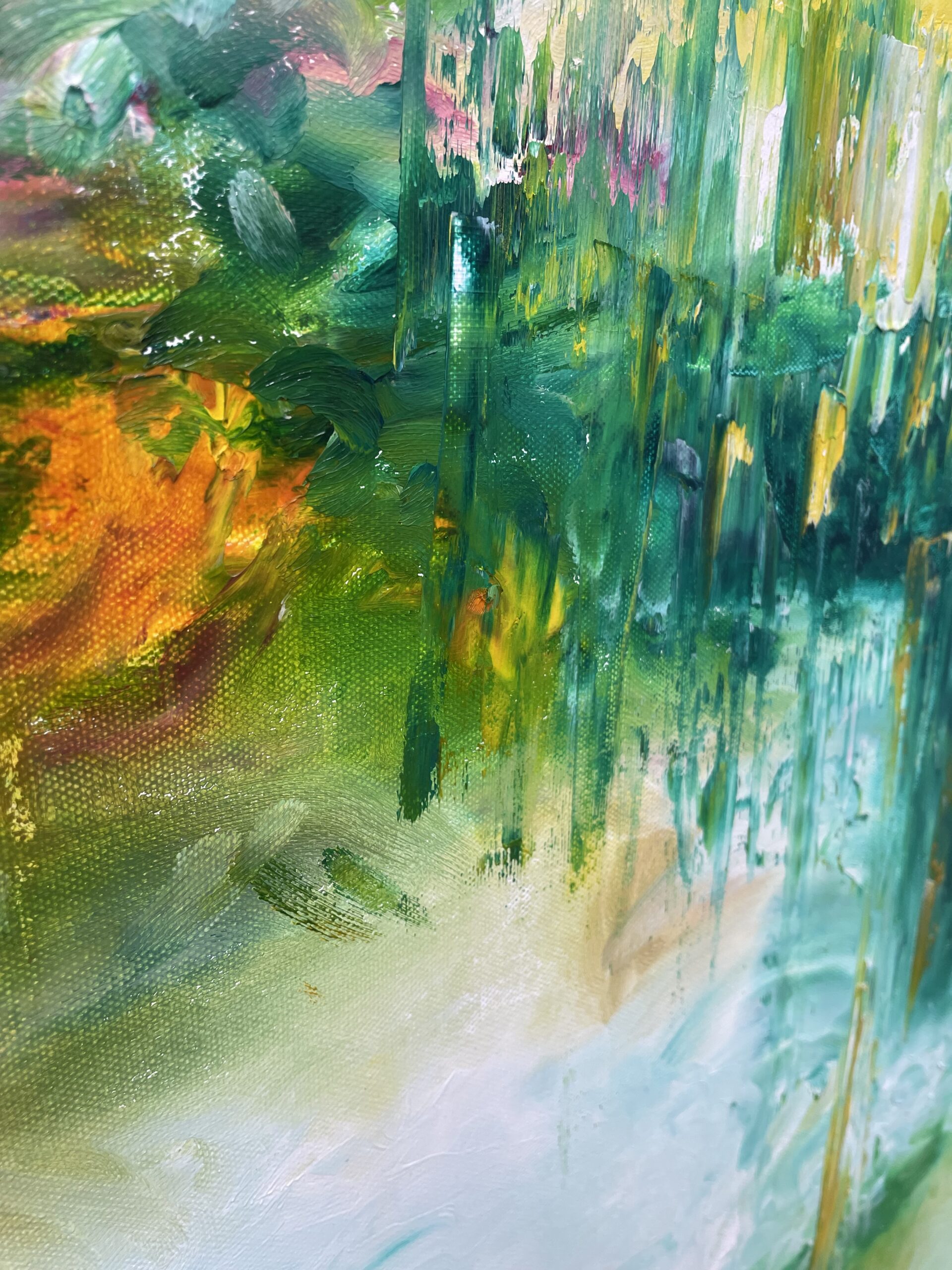 Das Bild wirkt wie ein abstrakte , atmosphärisches Gemälde. Dominant sind Türkis-, Grün-und Blautöne, die an Wasser, Nebel und Natur erinnern.Darüber und darin liegen Kräftige Akzente in Pink, Gelb und Orange wie Lichtreflexe oder aufbrechende Energie wirken.