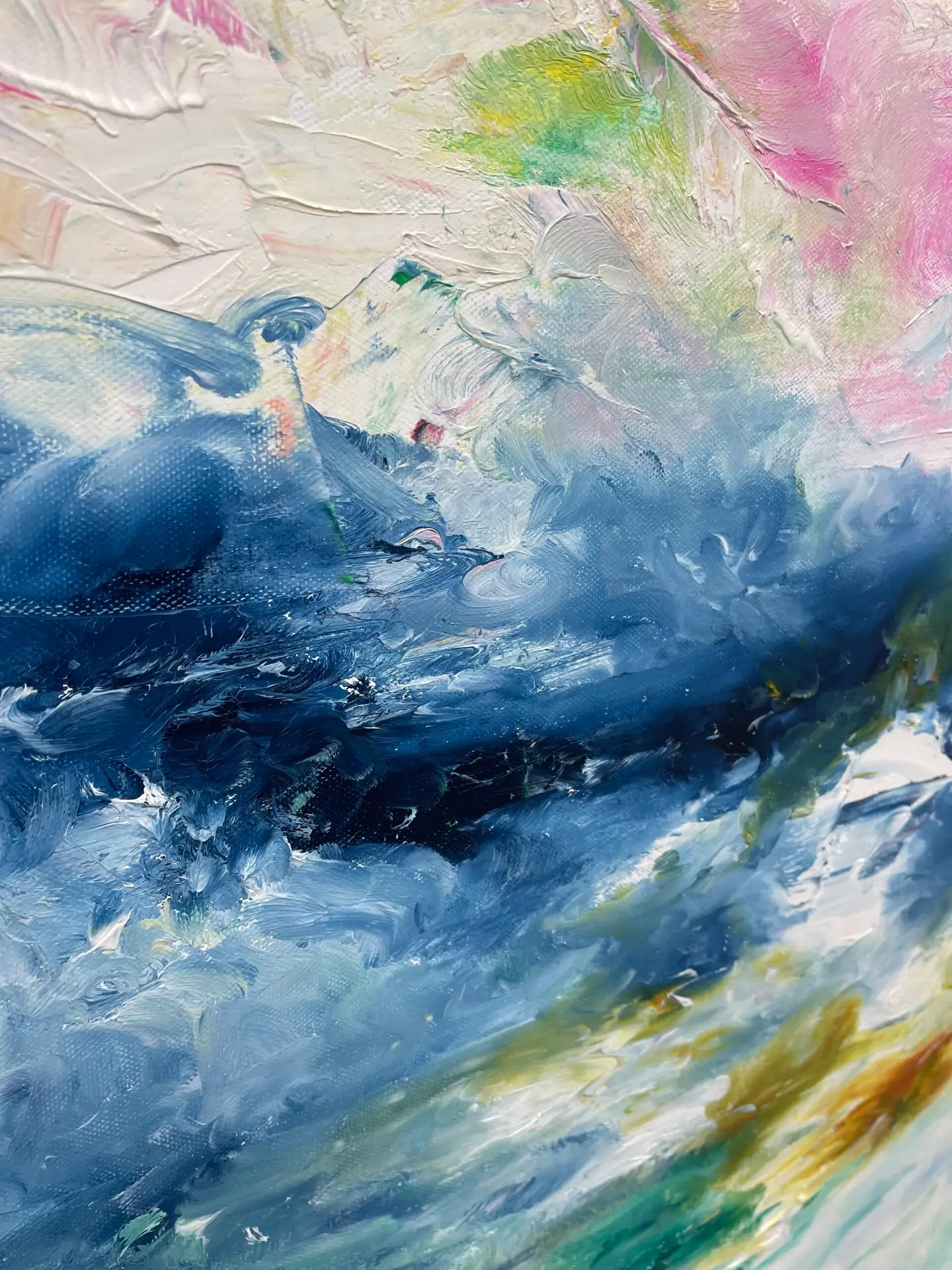 Die Farben scheinen ineinander zu fließen, mit weichen Übergängen und stellenweise kräftigen Pinselspuren-besonders im oberen Bereich.Unten wirkt die Fläche ruhiger, fast milchig -transparent, während oben mehr Bewegung und Kontrast entsteht.