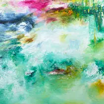 Ein abstraktes Gemälde mit fließenden Blau-, Grün- und Türkistönen , durchsetzt von leuchtenden Pink und Gelbakzenten. Es erinnert an Wasser, Licht und Bewegung und wirkt ruhig und atmosphärisch .
