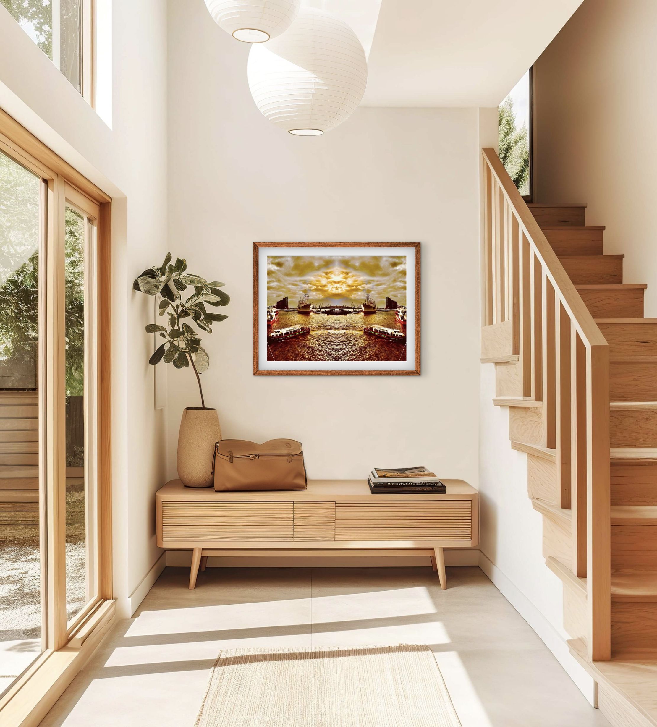 Hamburger Hafen I in Holzrahmen Wurzelholz, Passepartout Creme