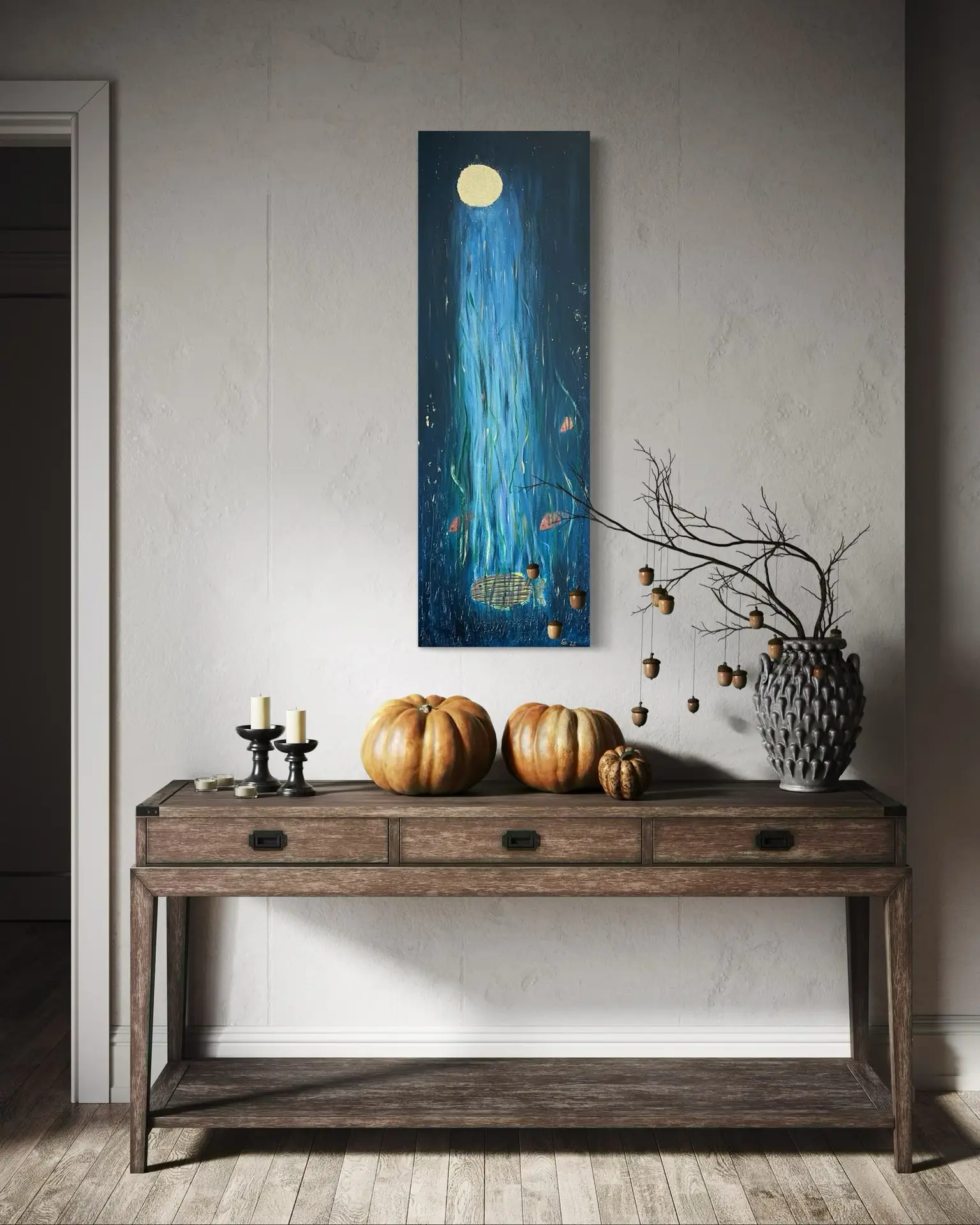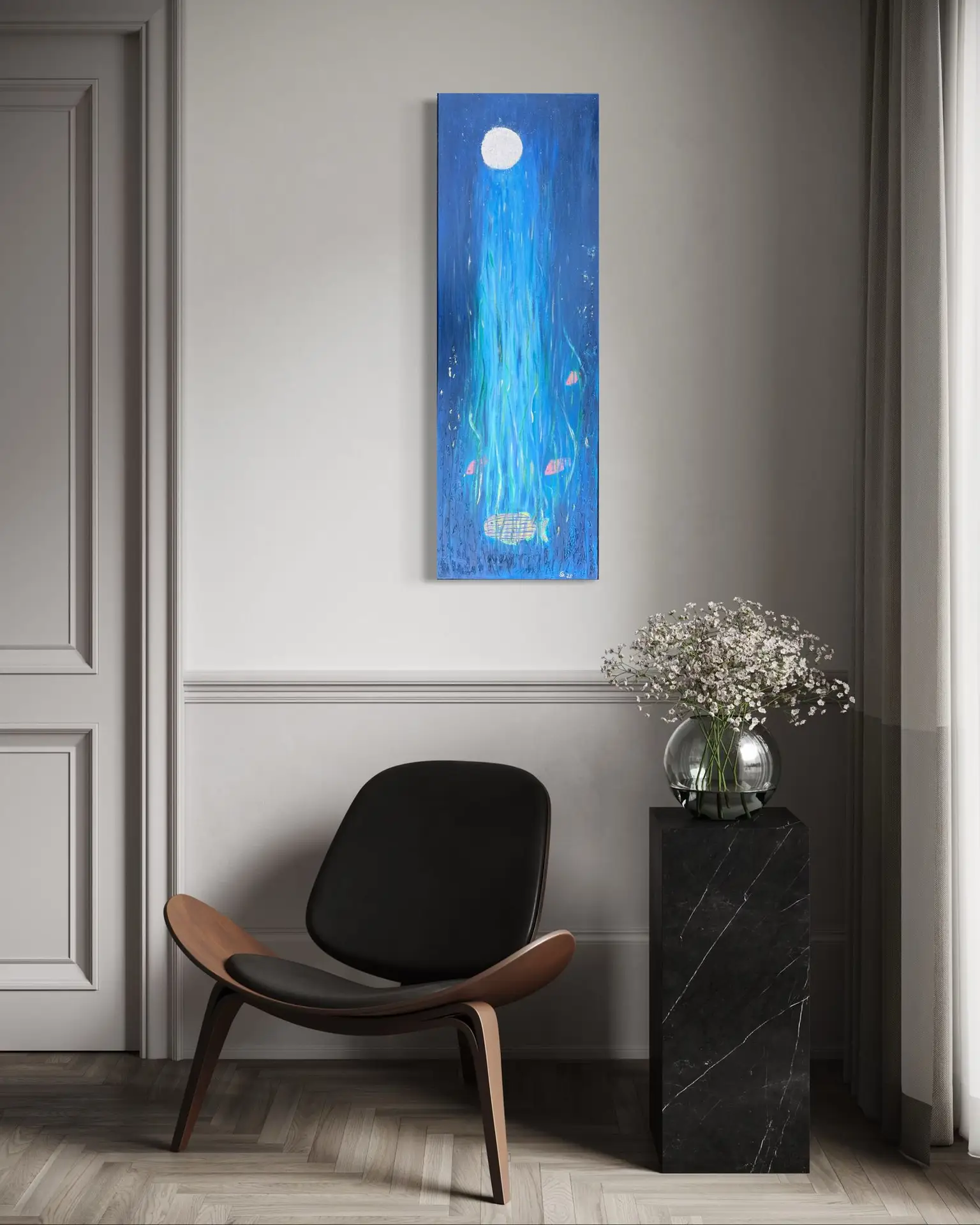 Das Gemälde zeigt eine Unterwasserszene, die von oben durch das Wasser vom Mond beleuchtet wird. Im Algengrund tummeln sich verschiedene Fische