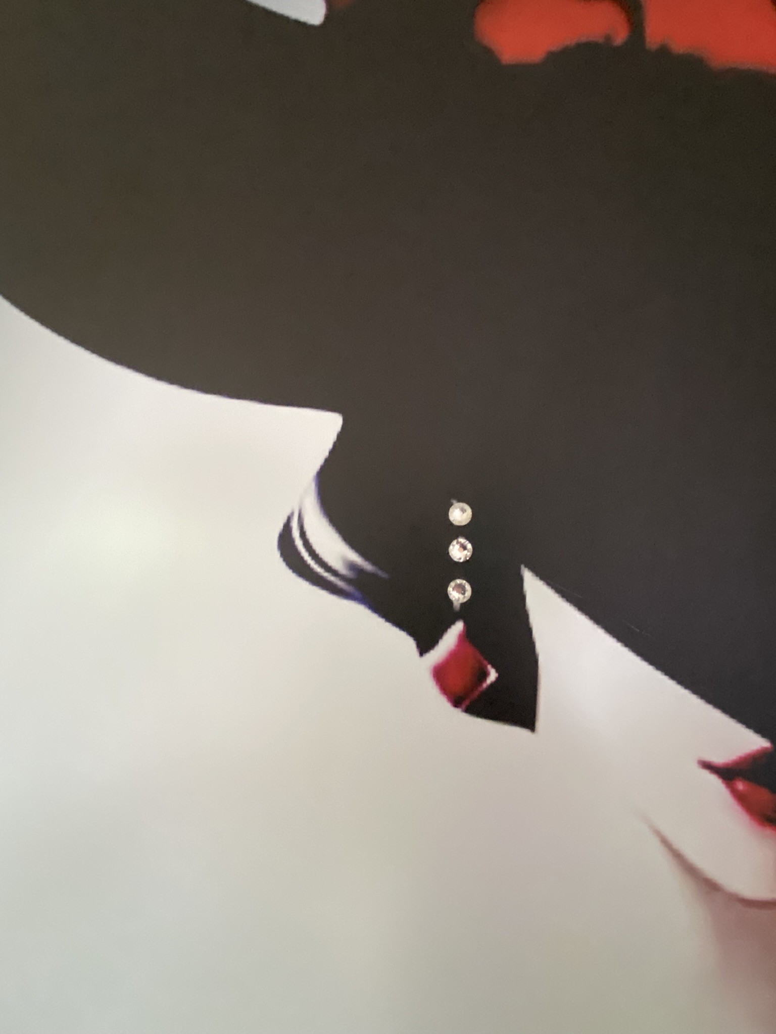 Fotodirektdruck auf weißer Alu-Dibond Platte 3 mm. Die Ohrringe sind mit je 3 Steinen versehen. Die Maße dieses Kunstwerkes sind 1m x 1m.