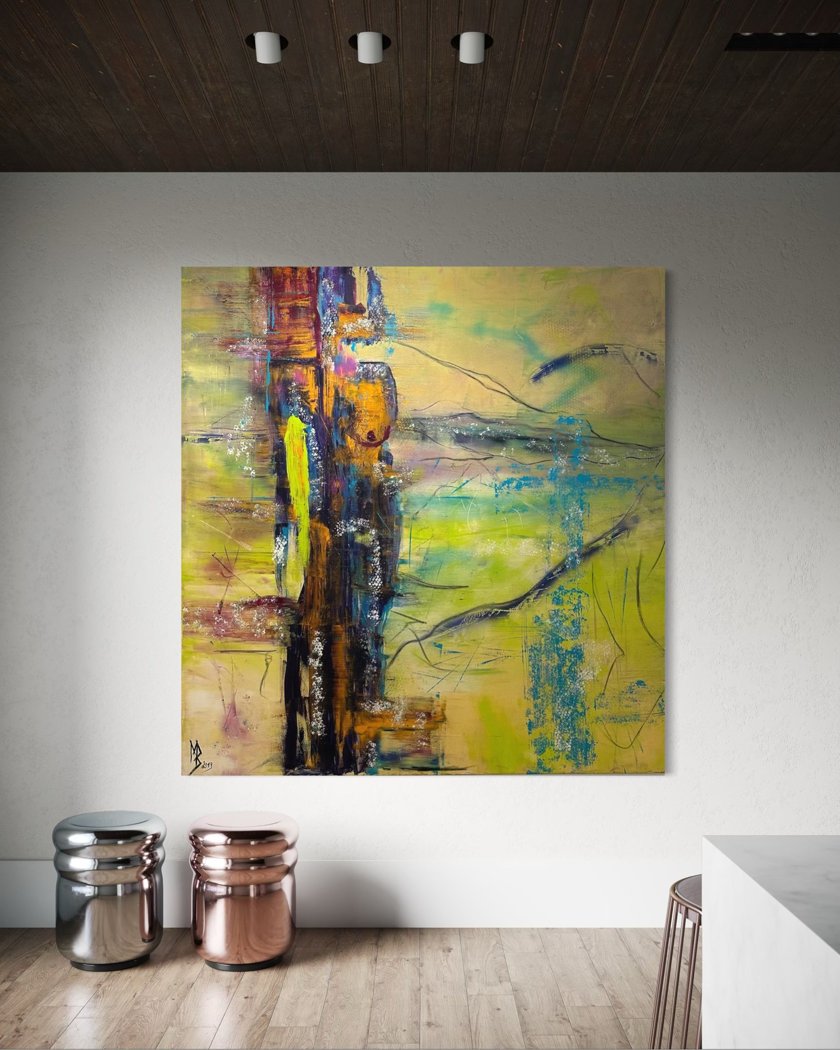 Die Figur wirkt zurückgenommen, beinahe scheu. Sie entzieht sich dem direkten Blick und öffnet damit einen Raum der Intimität. Diese Zurückhaltung ist bewusst gewählt: Der Künstler thematisiert den zunehmenden Verlust der Verbindung zur eigenen Intuition in einer überreizten, lauten Welt.