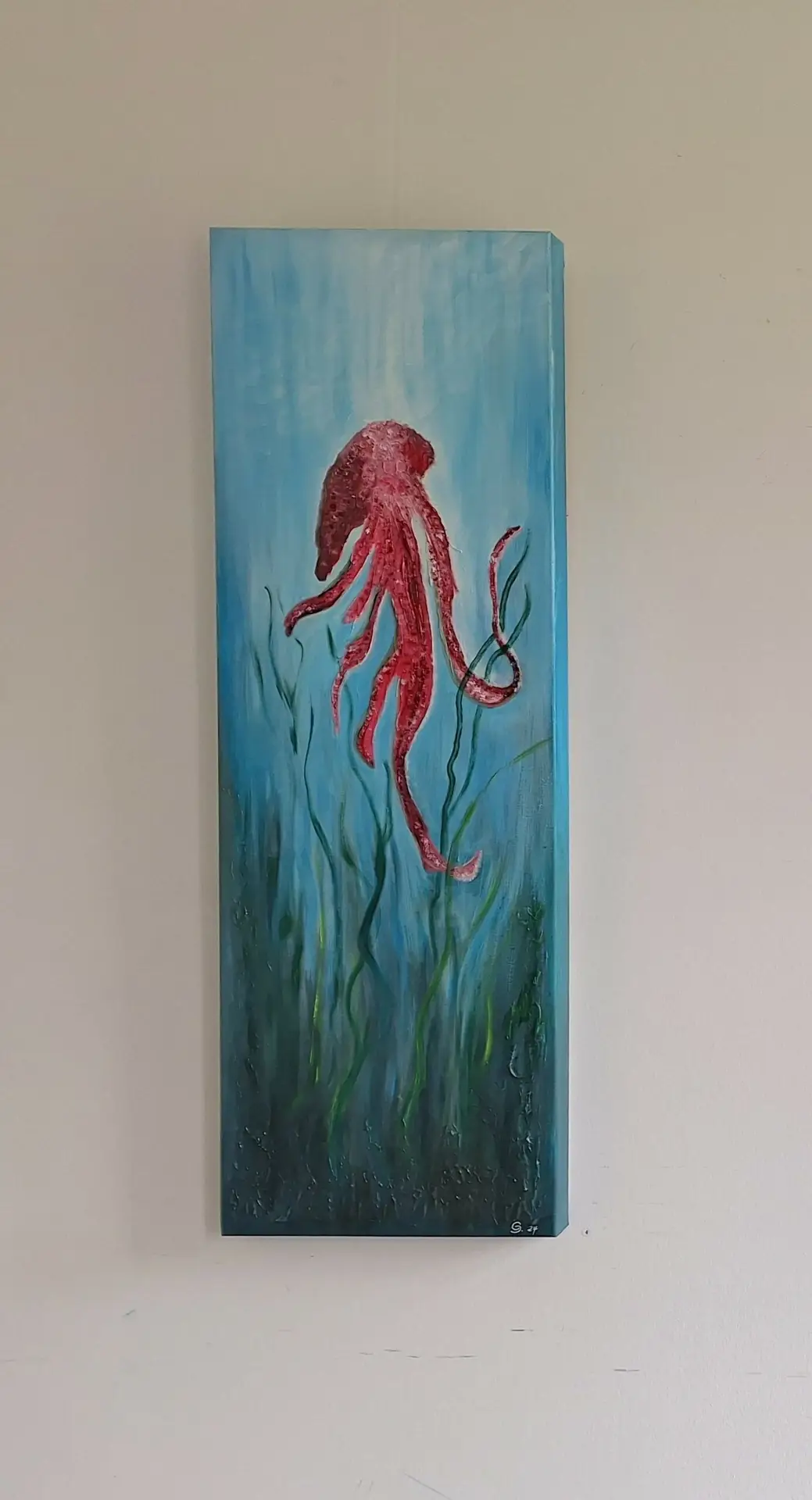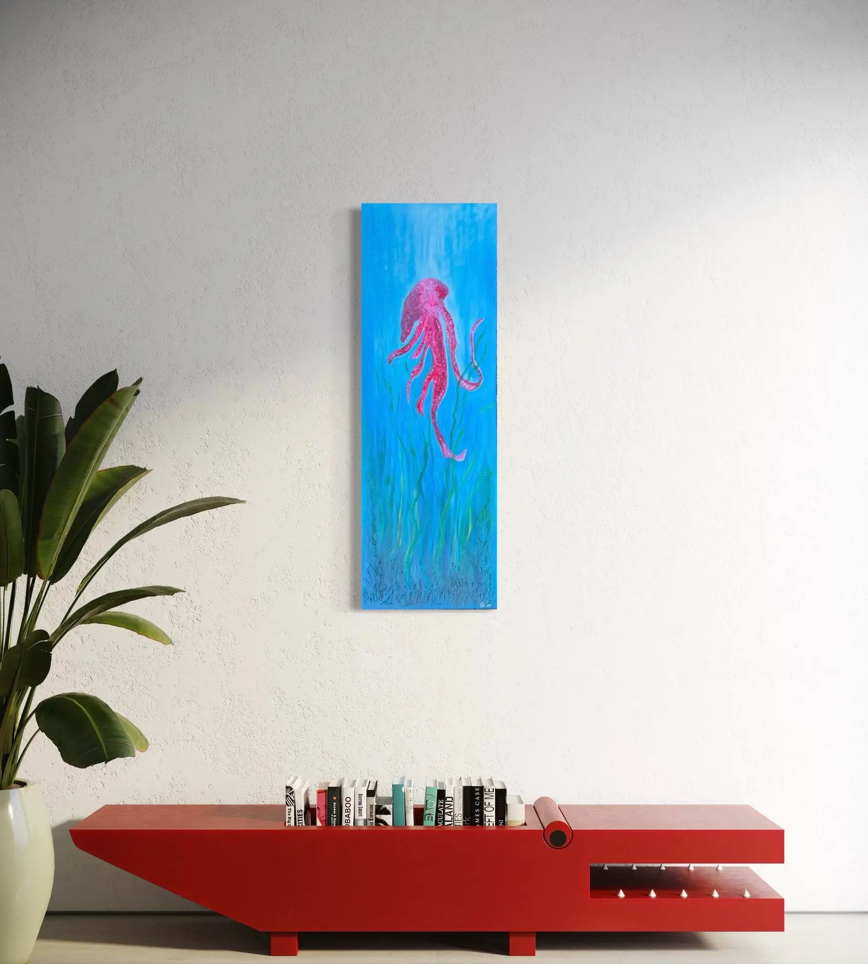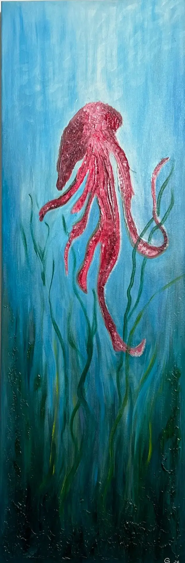 Das Gemälde zeigt eine Unterwasserlandschaft in dem ein roter Oktopus aus dem Algenuntergrund nach oben aufsteigt. Hier ahnt man den Lichteinfall von der Wasseroberfläche.