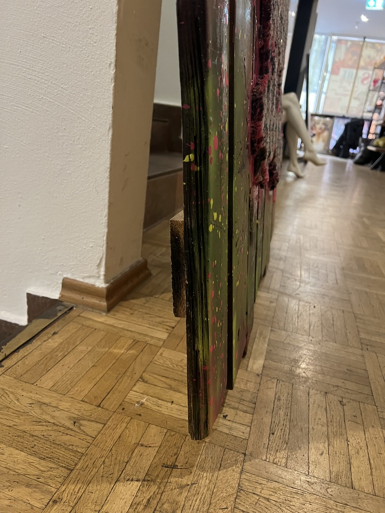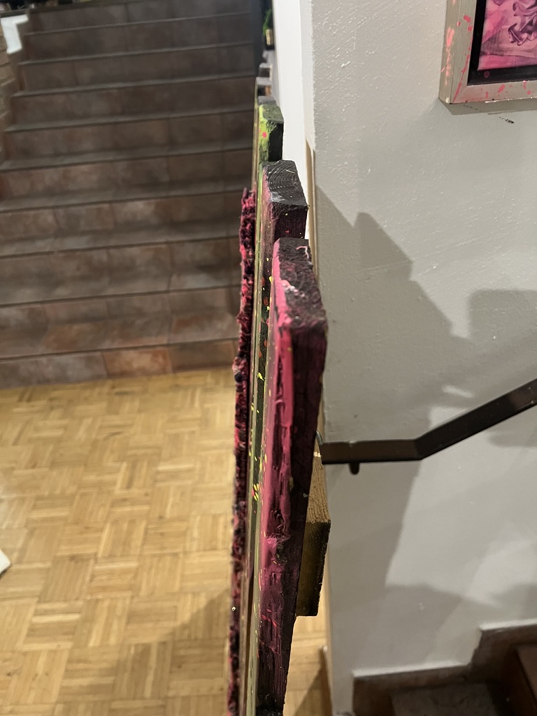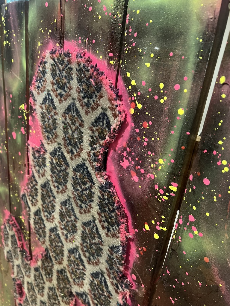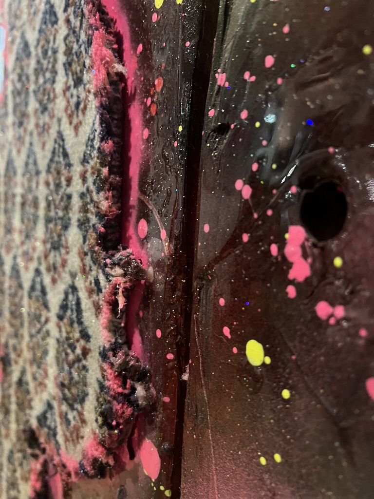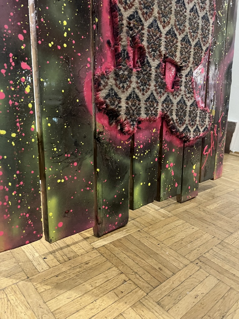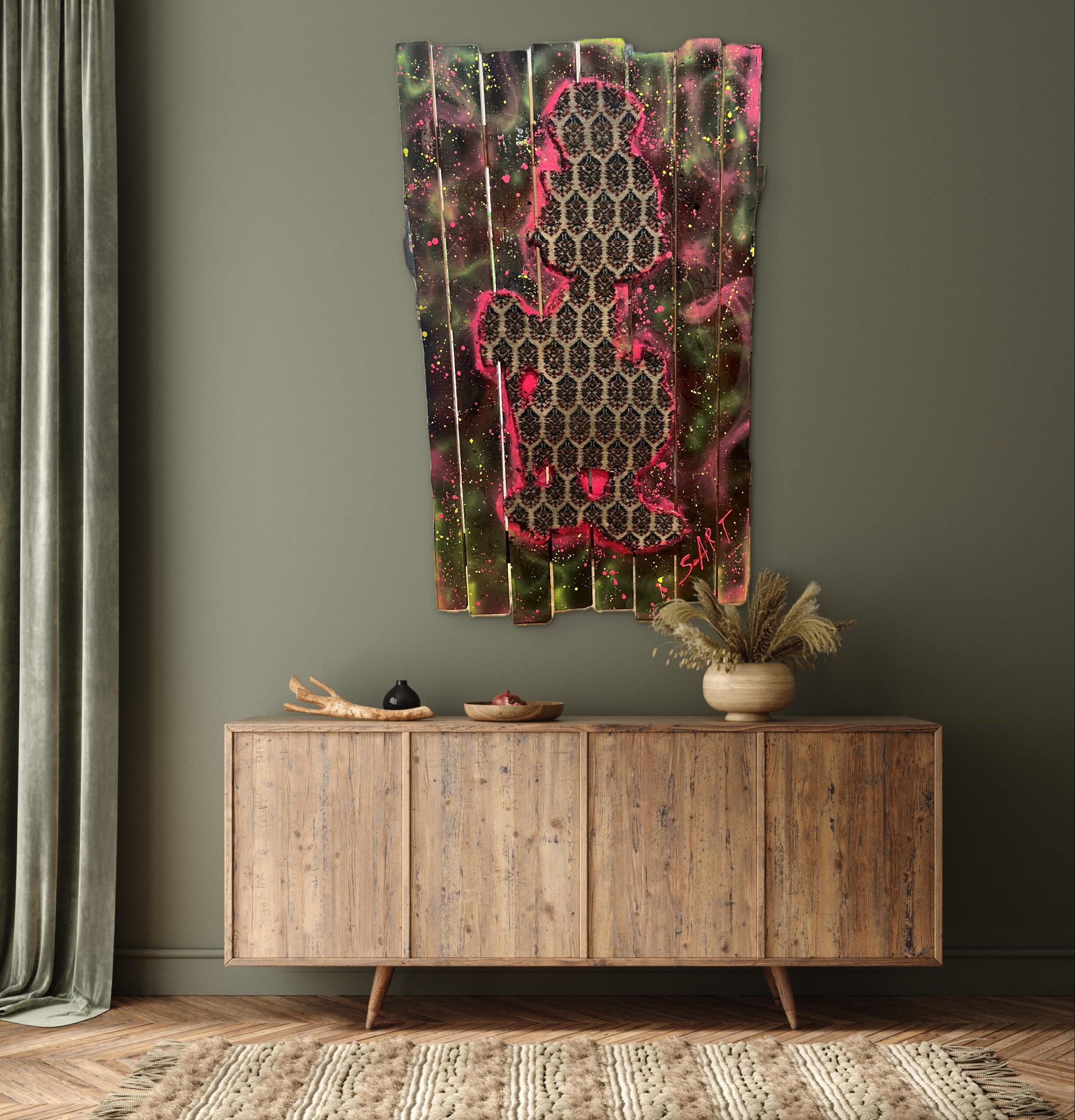 Dieses außergewöhnliche Mixed-Media-Werk kombiniert einen echten Perserteppich mit handbearbeitetem Holz und leuchtenden Urban-Art-Lackierungen. Der Teppich wurde so zugeschnitten, dass er die Silhouette einer weltbekannten Comicfigur eines exzentrischen, wohlhabenden Erpels darstellt – ein subtiler, humorvoller Verweis auf Popkultur ohne direkte Nennung. Neonfarbene Spritzer und Graffiti-Elemente bilden einen spannenden Kontrast zur ornamentalen Struktur des Teppichs und verleihen dem Werk eine kraftvolle Street-Art-Ästhetik. Ein einzigartiges Statement-Piece, das traditionelle Handwerkskunst, Luxus und zeitgenössische Urban-Art auf außergewöhnliche Weise verschmelzen lässt – exklusiv für anspruchsvolle internationale Sammler.