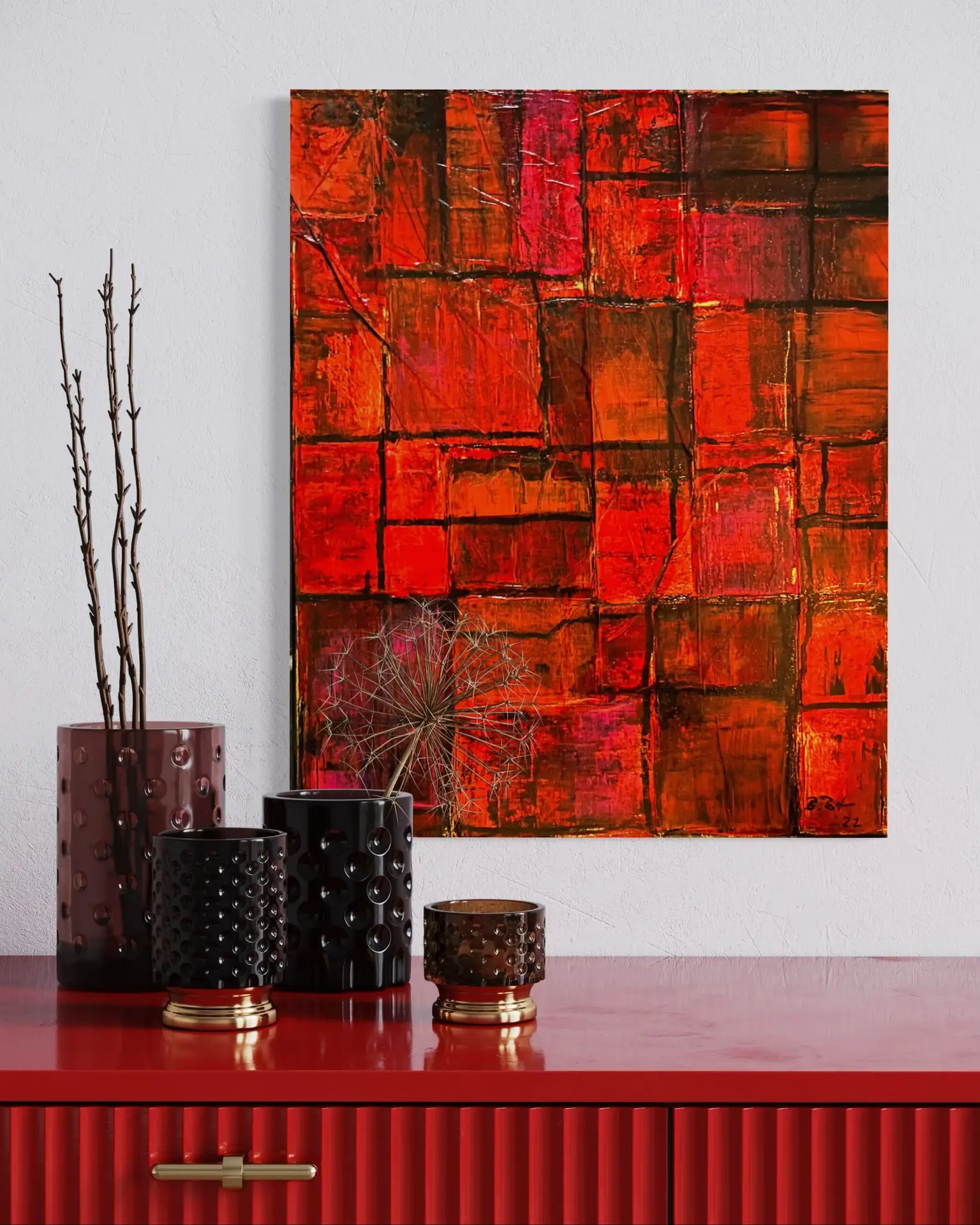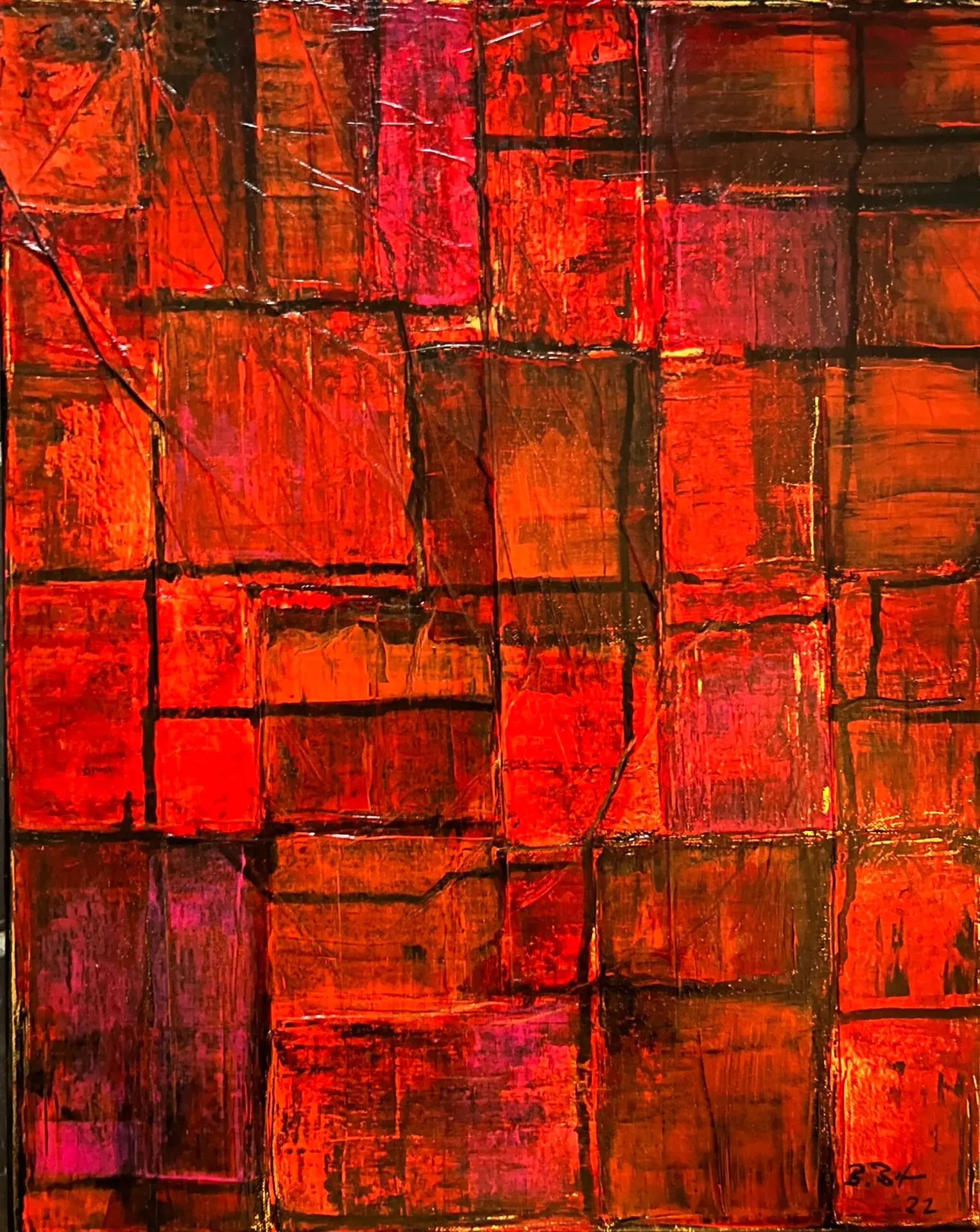 Abstraktes Gemälde mit rechteckigen, in Gitterform angeordneten Flächen in intensiven Rot- und Schwarztönen. Teilweise blitzt die darunter befindliche Goldfolie durch.