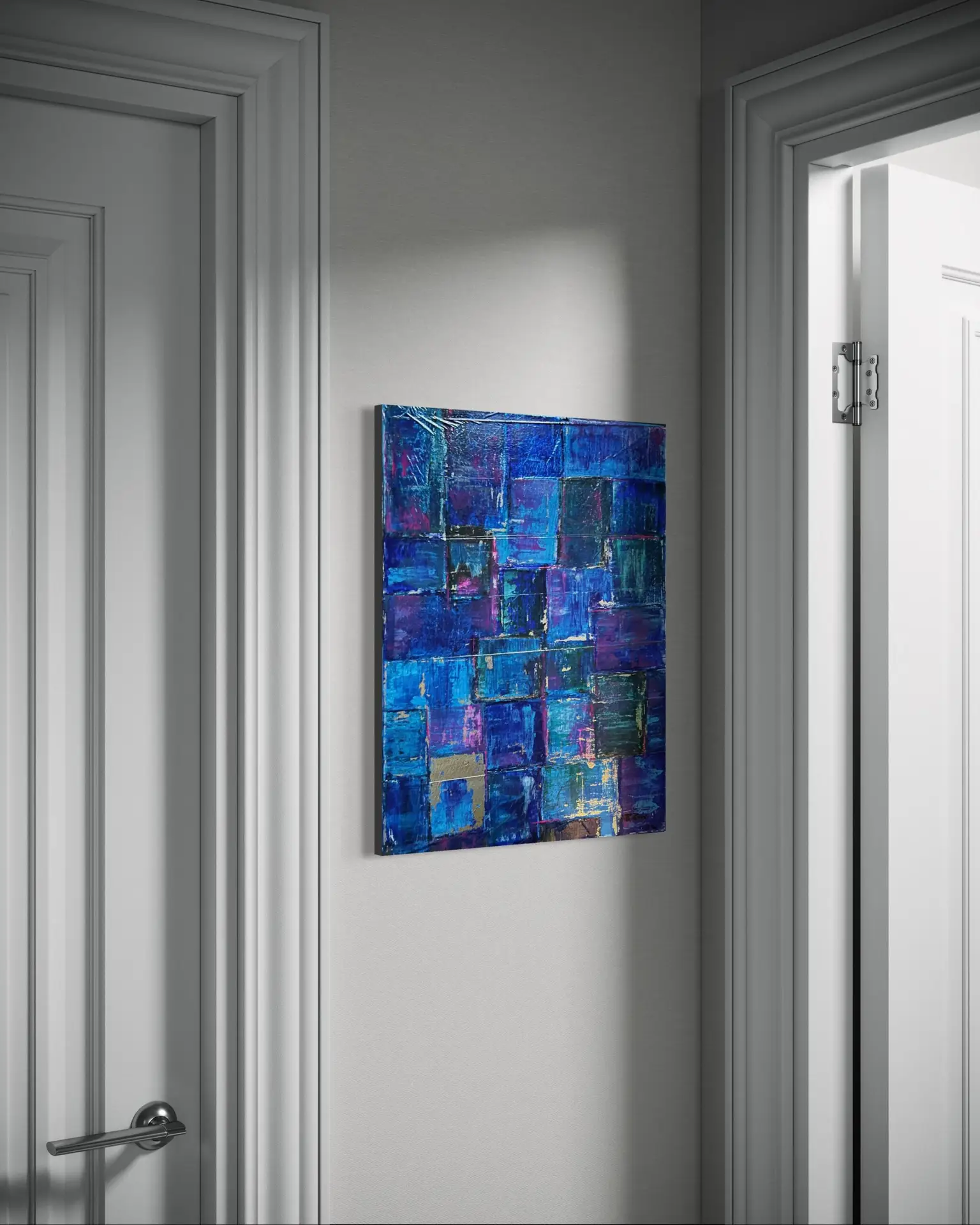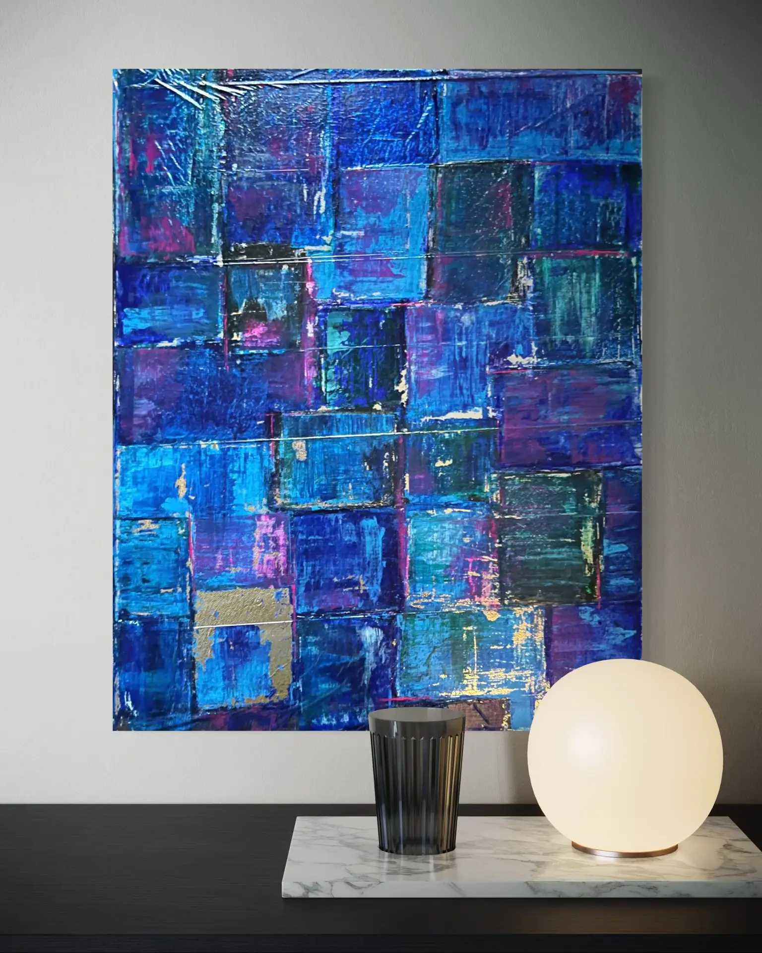 Abstraktes Acrylgemälde im Hochformat mit überlagernden, rechteckigen Farbflächen in intensiven Blau-, Violett- und Türkistönen, teils mit silbernen Akzenten und strukturierter Oberfläche für monderne Wanddeko.