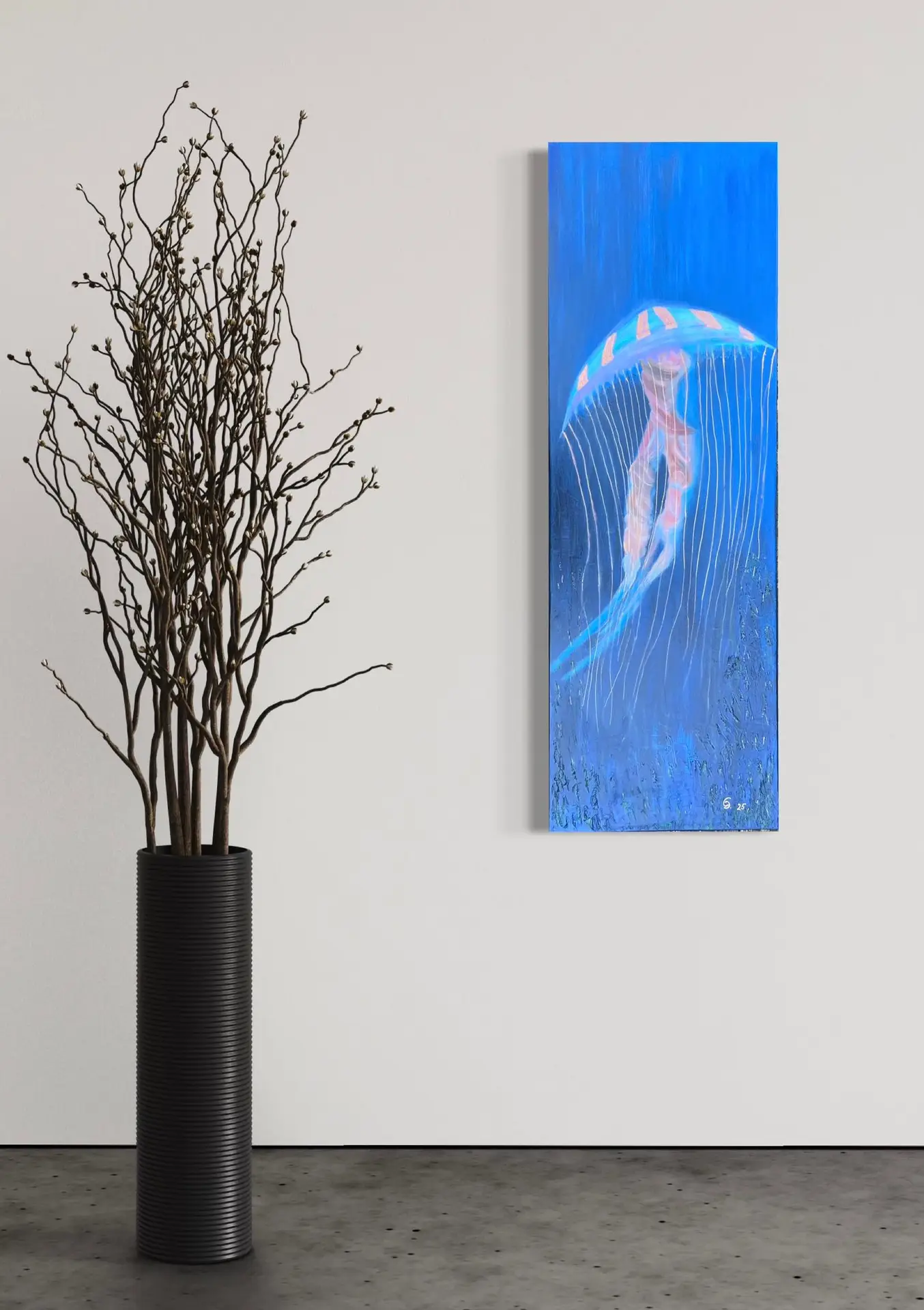 Das Gemälde zeigt eine Schirmqualle beim Aufstieg. Ihre feinen goldenen Tentakel scheinen im dunklen Hintergrund schwerelos zu sein. Eine feine Textur unterstützt die Farben von Blau über Türkis, Rosa, Terra und Gold.