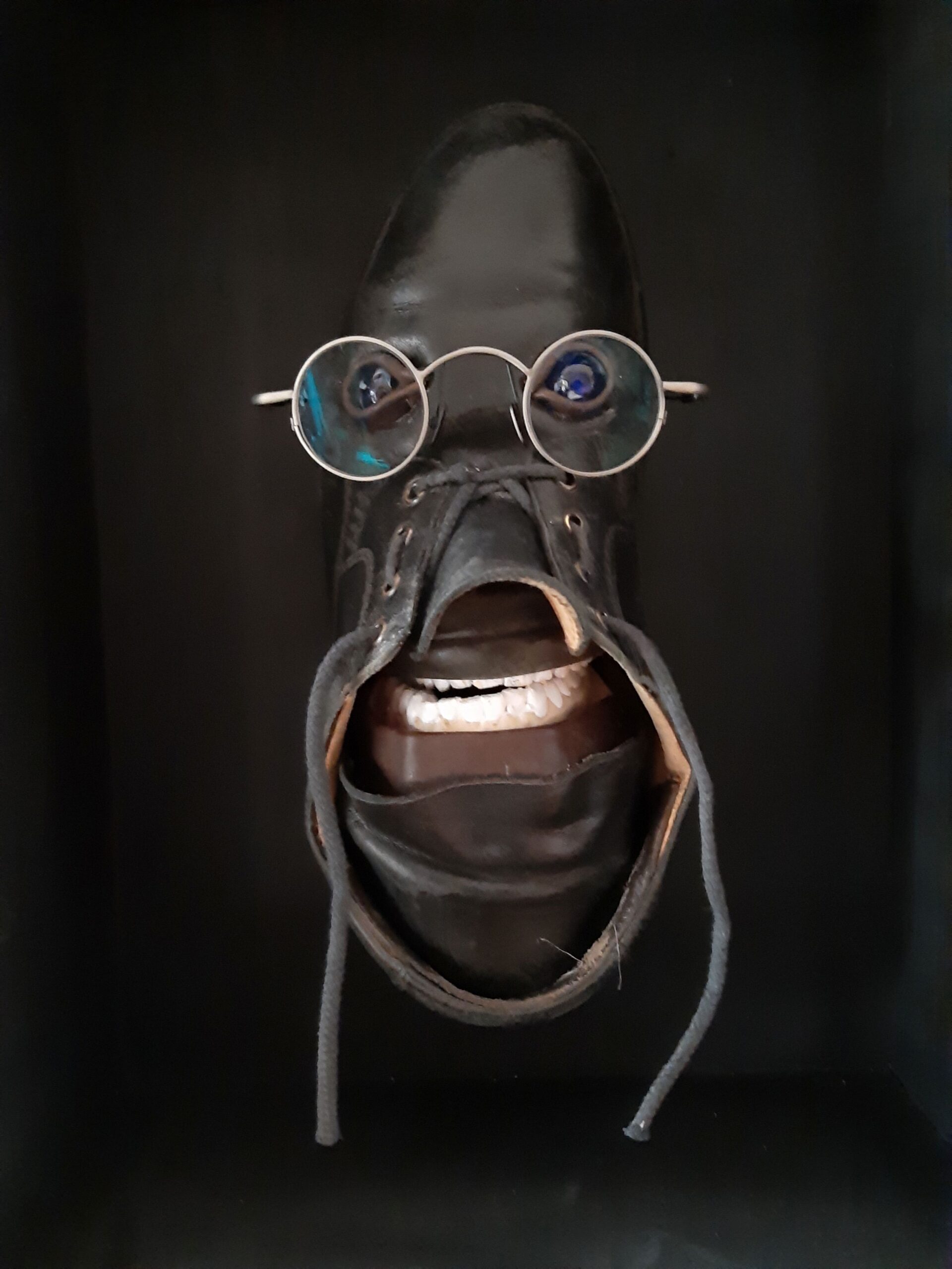 Schuhcharakterkopf Maze aus getragnen Schuhen, präsentiert in schwarzen Holzkasten 40 x 30 x 15 cm