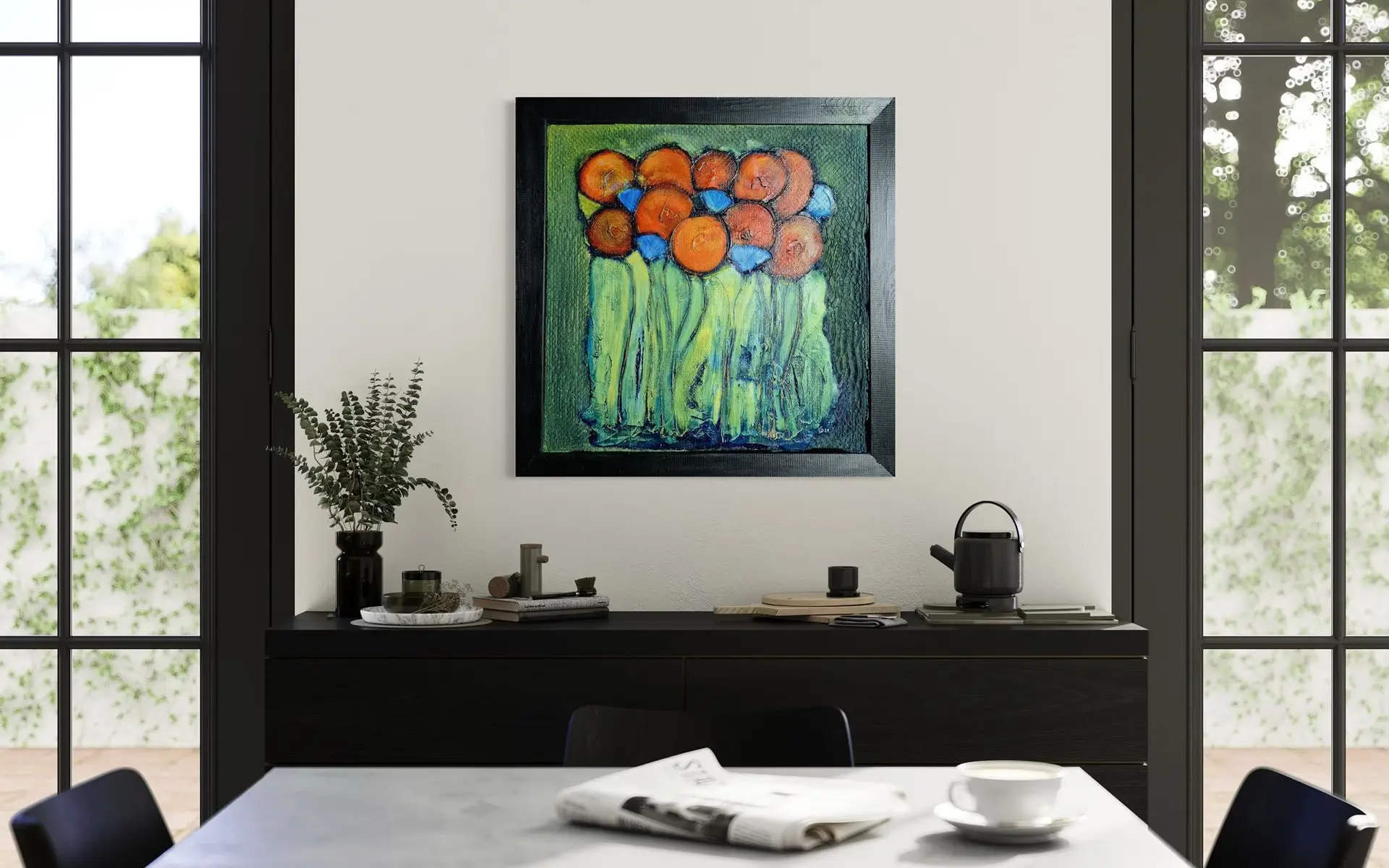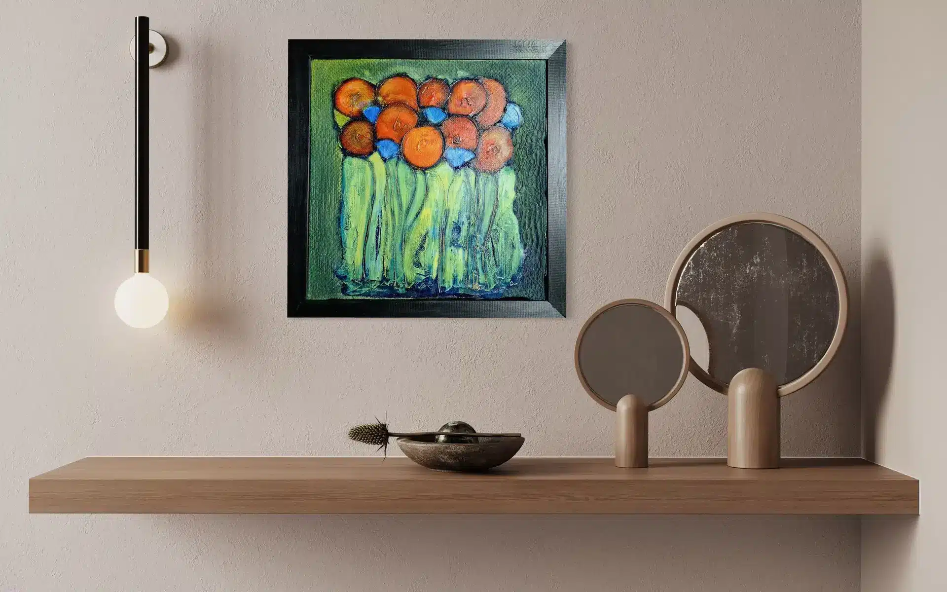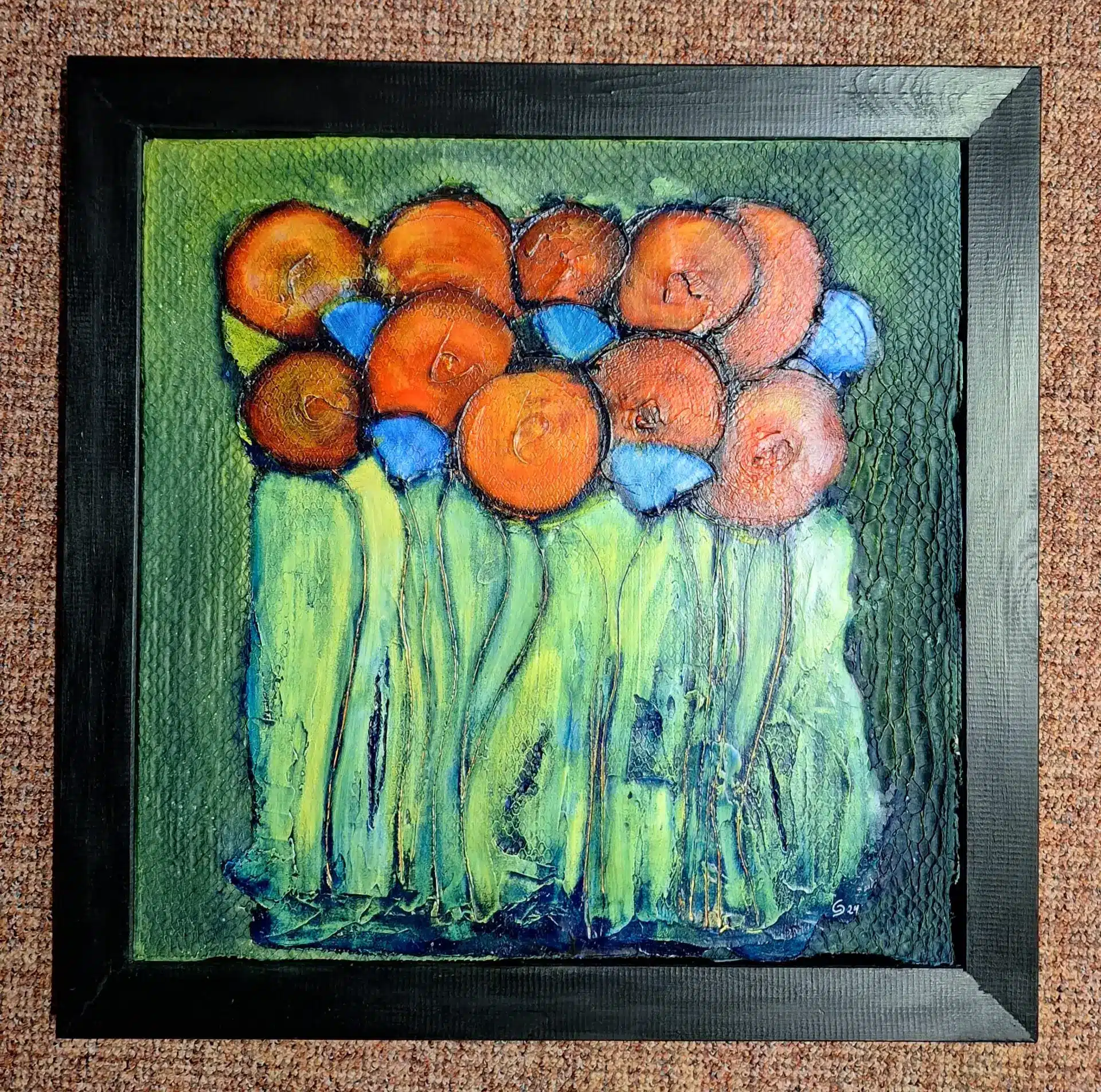 Dann in mehreren Schichten und mit verschiedenen Roten, Gelben und Blauen Acrylfarben die stilisierten Blüten und Stiele im kreativen Stil erarbeitet.