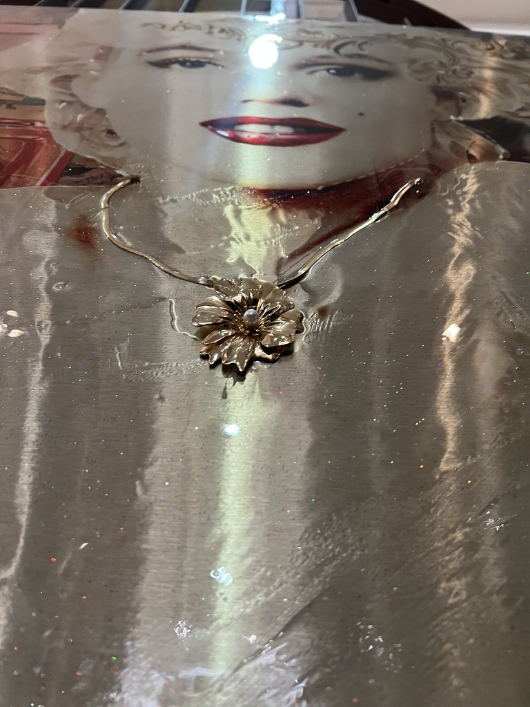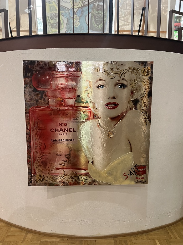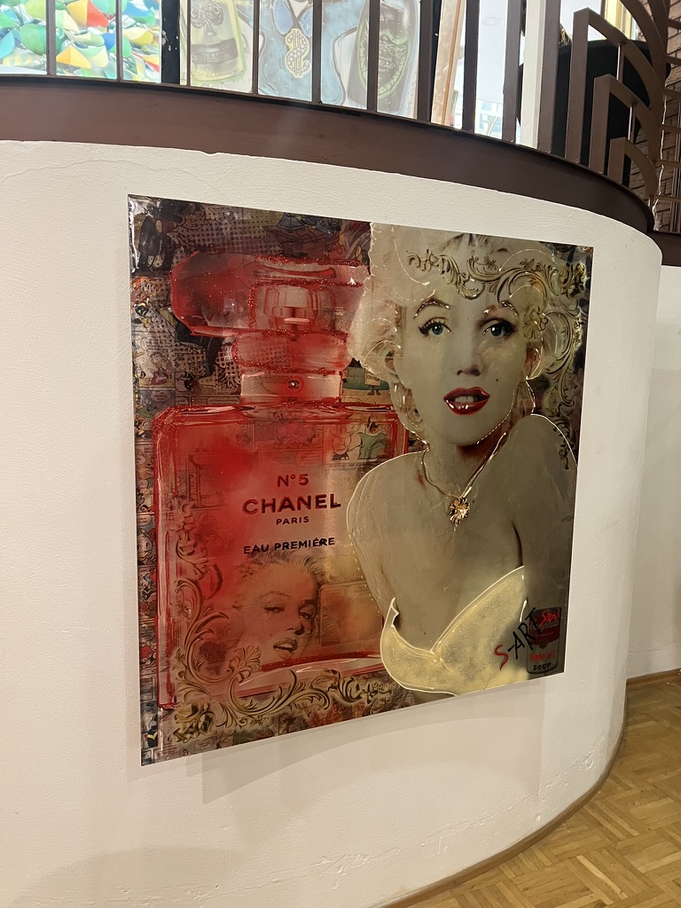 Dieses glamouröse Mixed-Media-Kunstwerk kombiniert das Porträt einer ikonischen Filmlegende mit der Silhouette eines weltberühmten Parfumflakons – ein Sinnbild für Luxus, zeitlose Schönheit und Popkultur. Strahlende Glanzeffekte, collagenartige Hintergründe und barocke Ornamentdetails verschmelzen zu einer opulenten Bildkomposition, die klassische Eleganz mit moderner Urban-Art-Ästhetik verbindet. Ein expressives Statement-Piece, das den Mythos von Verführung und filmischer Unsterblichkeit in ein zeitgenössisches Kunstwerk übersetzt