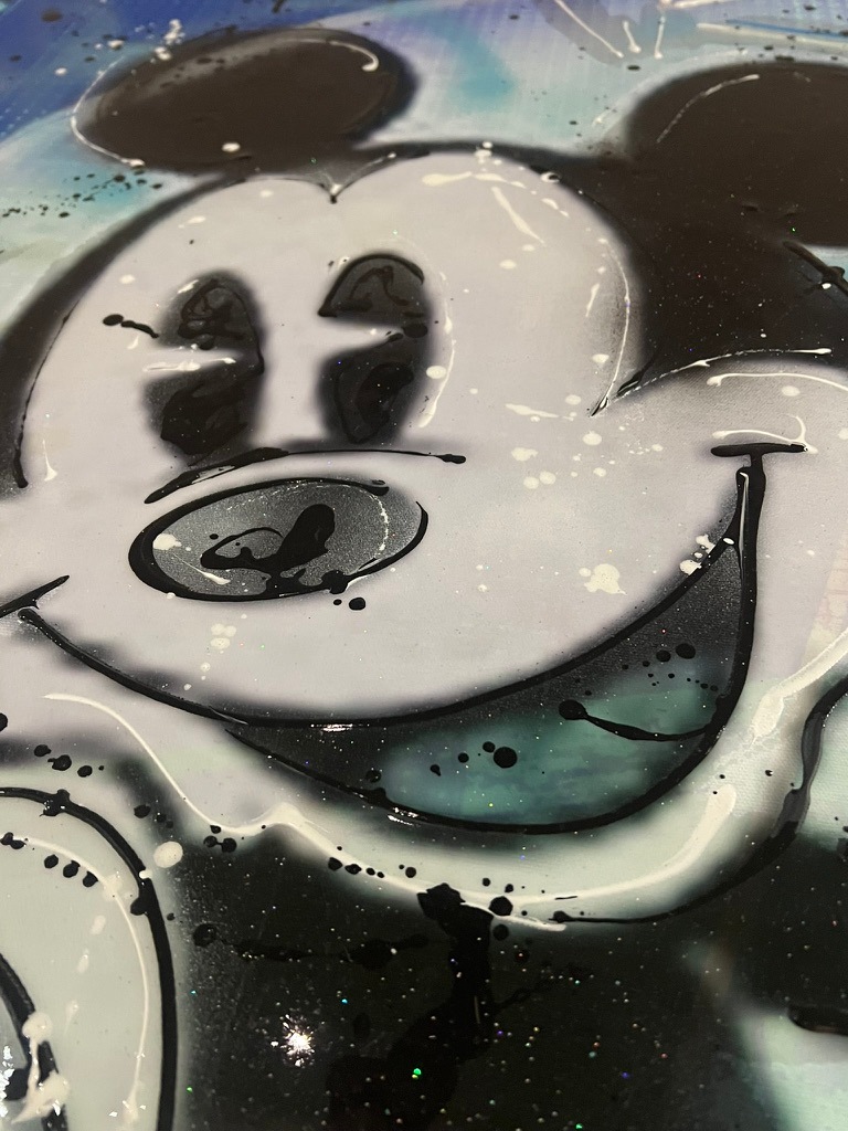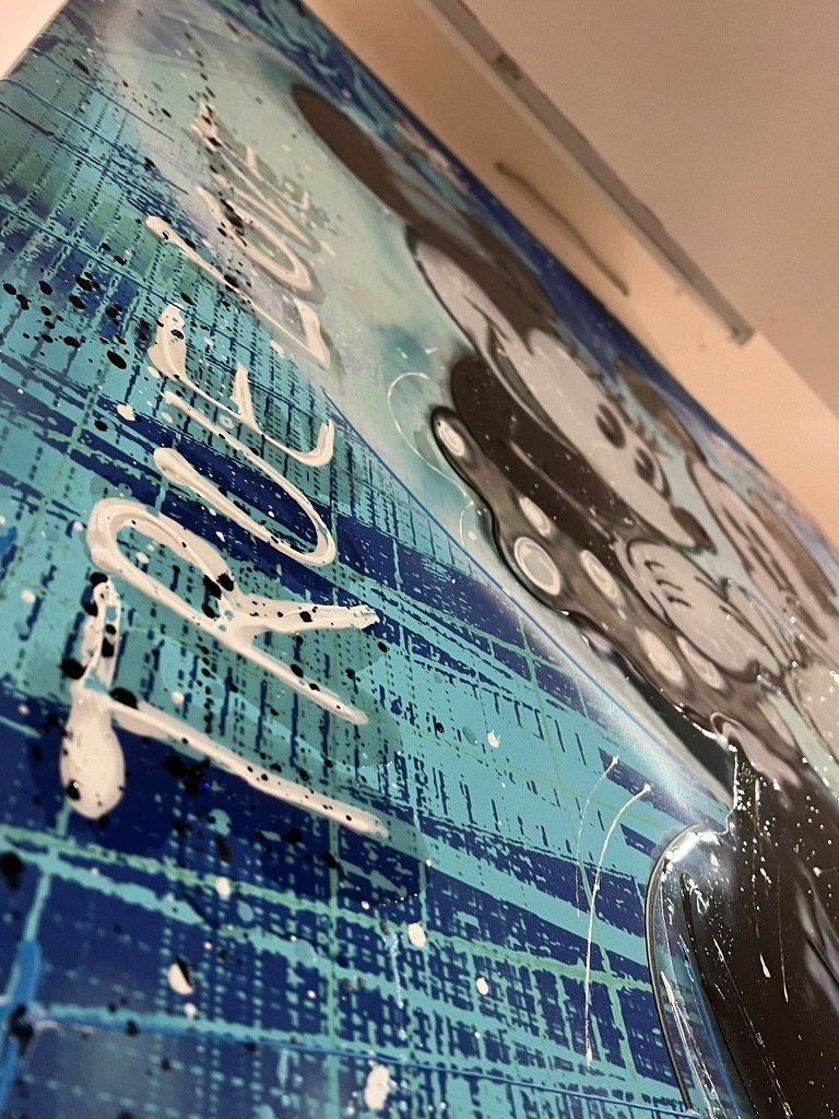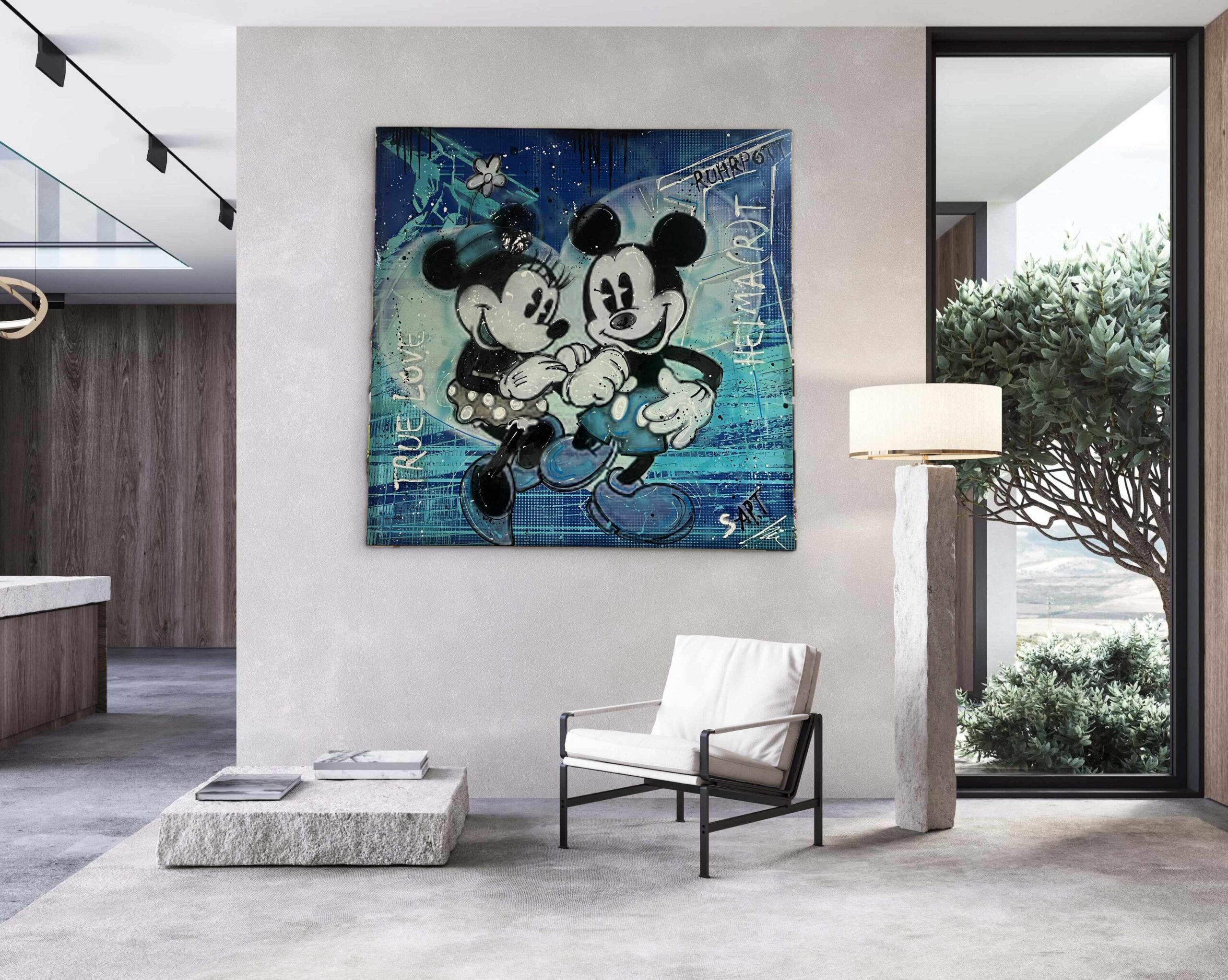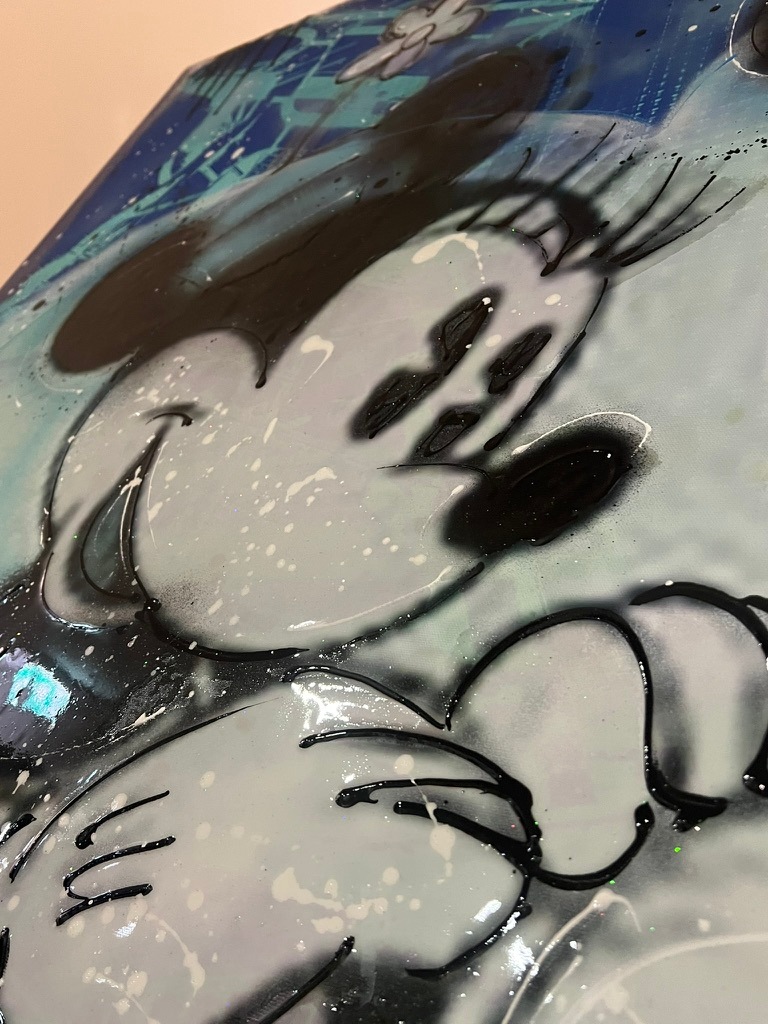 Dieses großformatige Pop-Art-Werk zeigt ein weltbekanntes Cartoon-Traumpaar in neu interpretierter Street-Art-Ästhetik. Dynamische Blautöne, Sprühfarben, Drip-Effekte und grafische Schriftzüge erzeugen eine kraftvolle Mischung aus Nostalgie und zeitgenössischem Urban-Style. Ein exklusives Statement-Piece, das Popkultur, Emotion und moderne Luxuskunst auf einzigartige Weise verbindet.