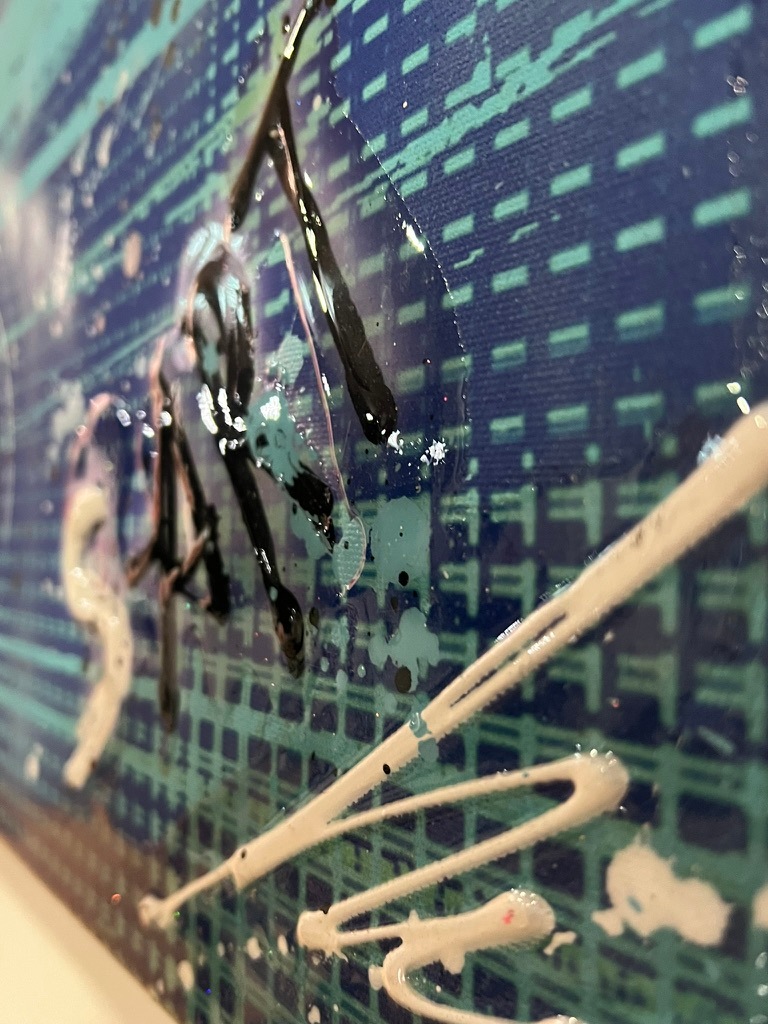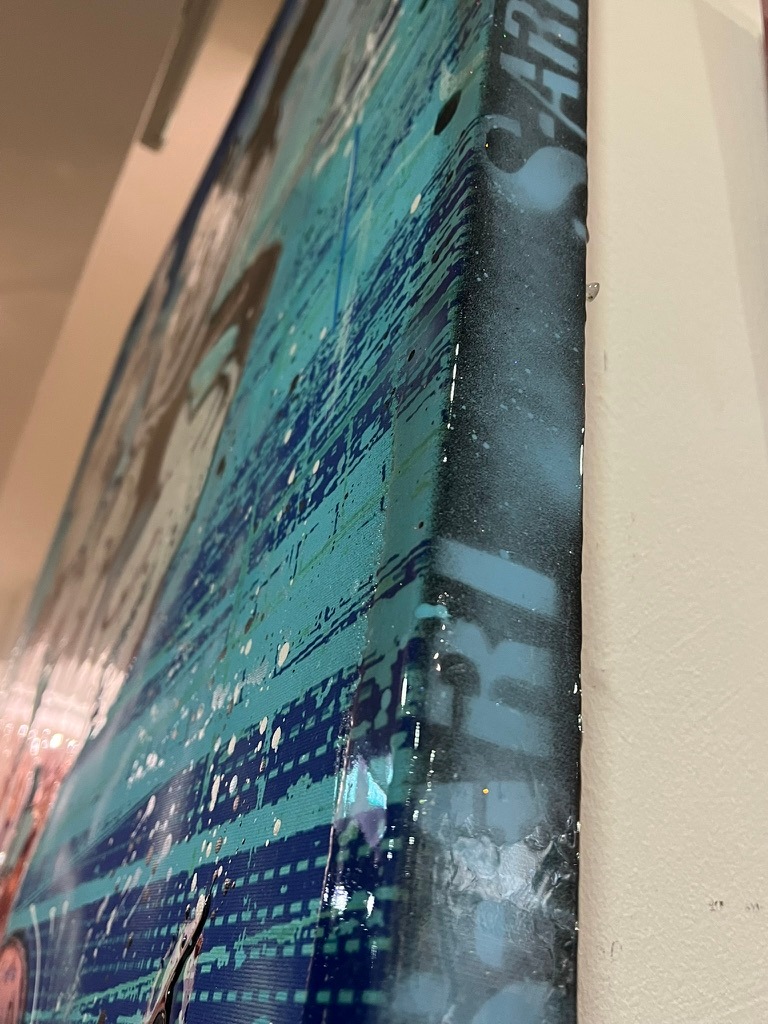 Jedes Bild entsteht in aufwendiger Mischtechnik mit zahlreichen Schichten: Siebdruck, Stencil-Graffiti, digitale Drucktechniken, expressive Acrylmalerei – final versiegelt mit hochglänzendem Kunstharz. Maße: ca. B 120 x H 120 x T 4