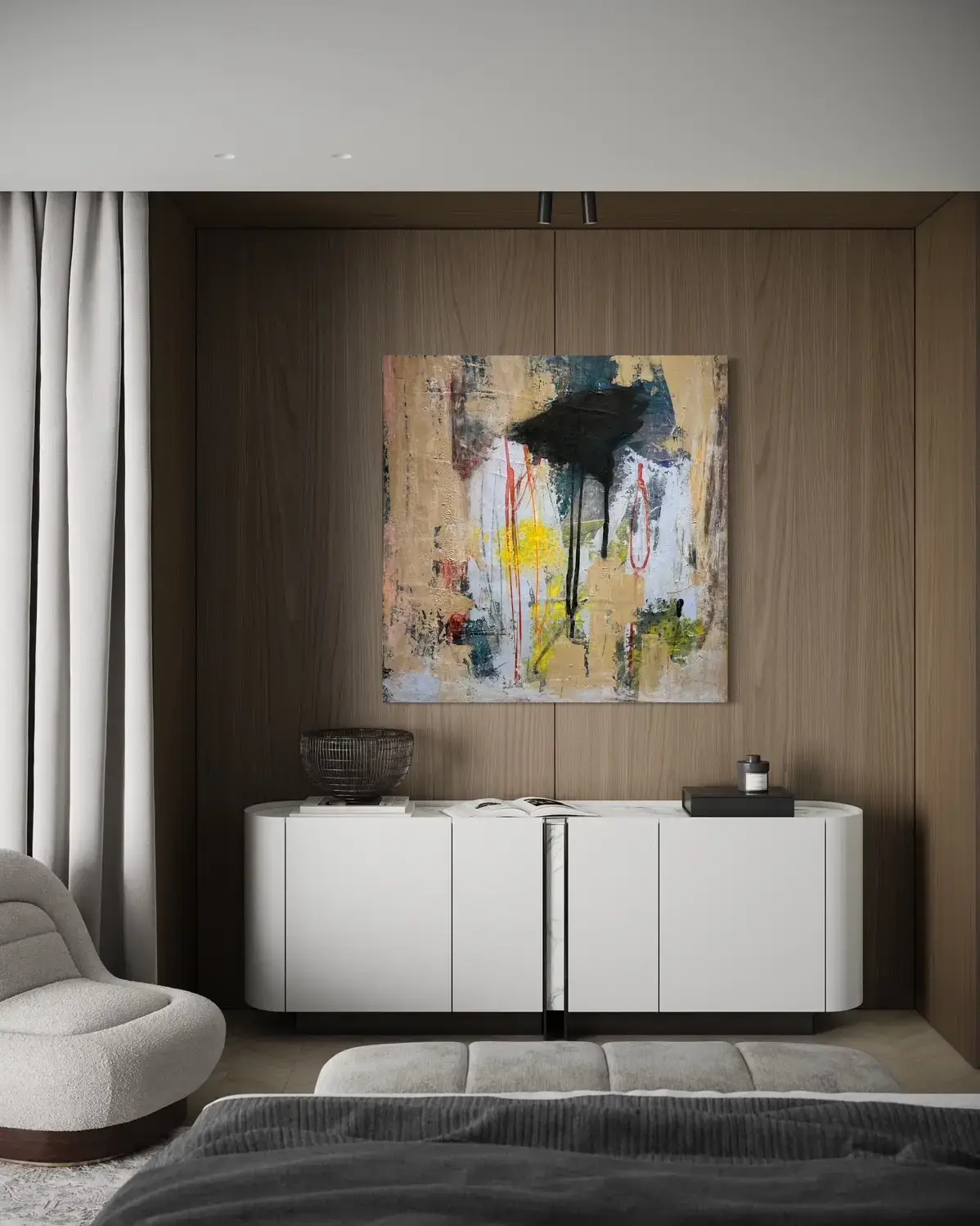 Zwischen der Ruhe des Beiges und der Energie der Kontrastfarben entsteht ein Dialog aus Kontrolle und Impuls, Stillstand und Bewegung.