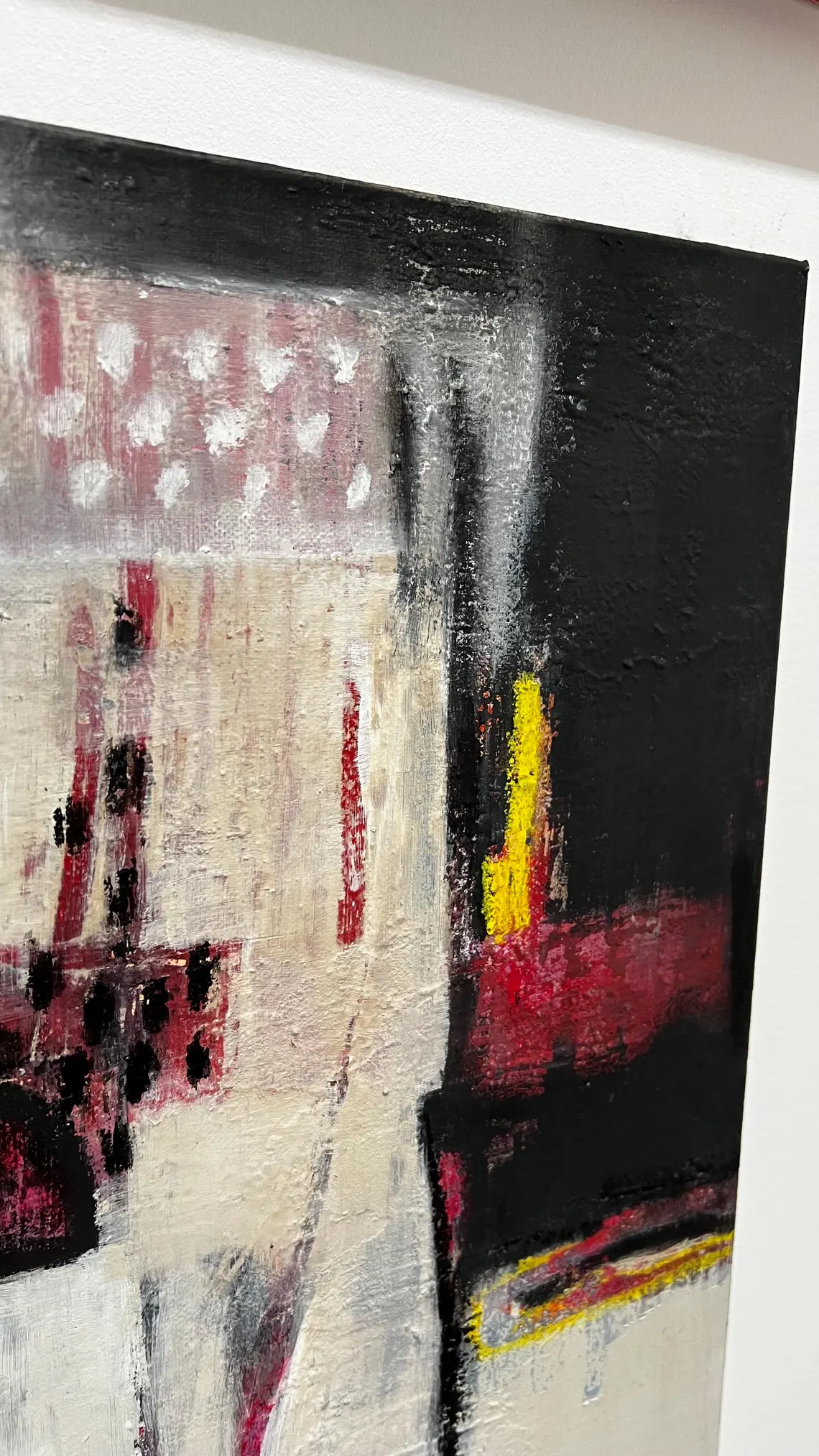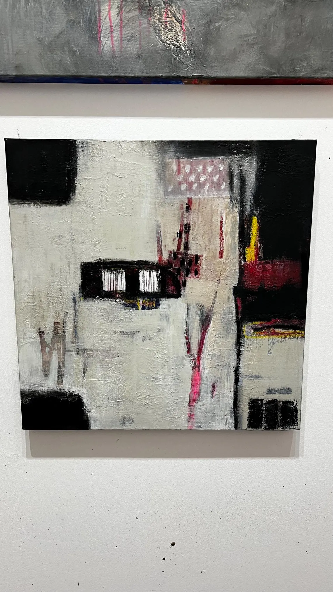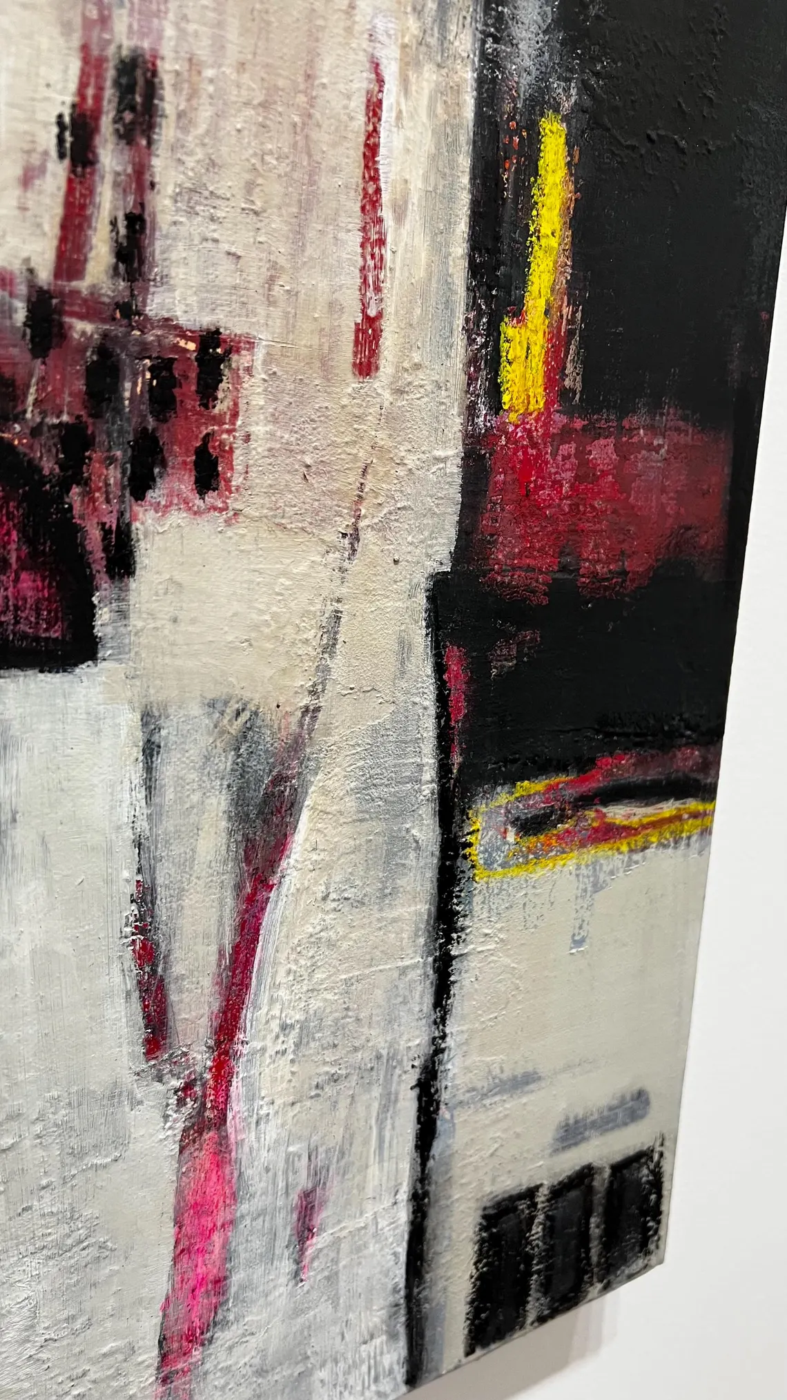 Ein heller Grund in sanftem Beige wird durchzogen von geometrischen Fragmenten, tiefem Schwarz und vibrierenden Akzenten in Rot, Magenta und Gelb.