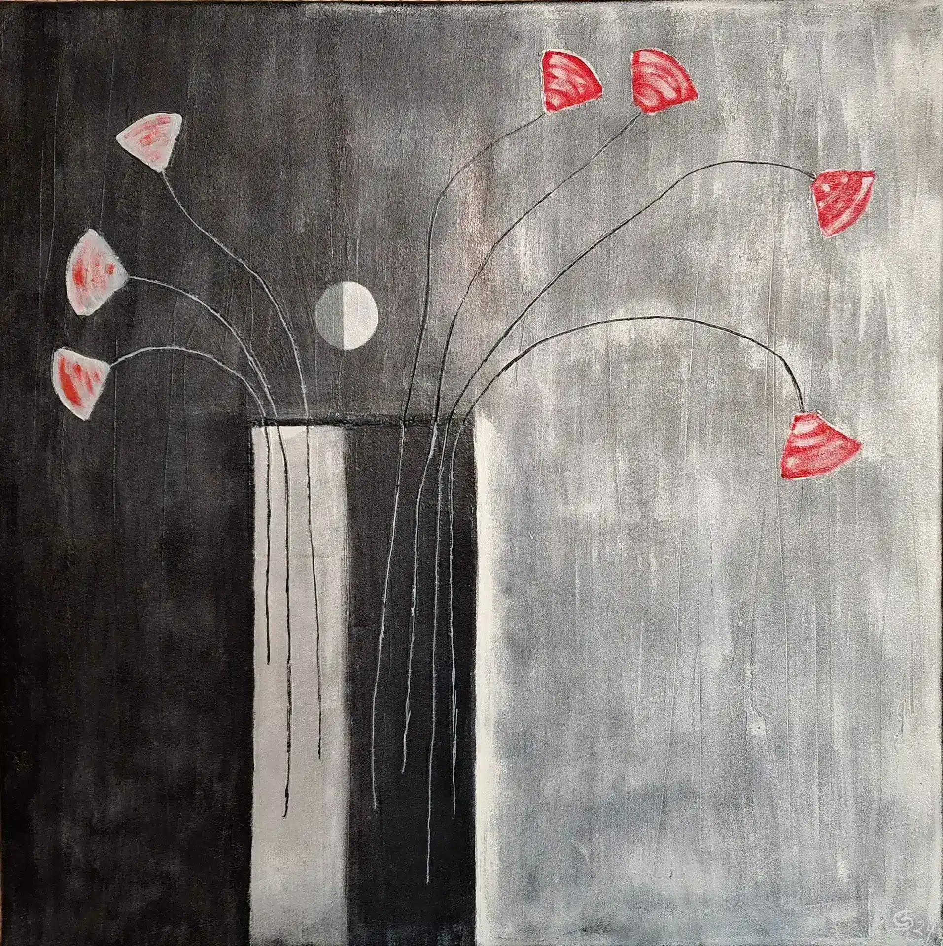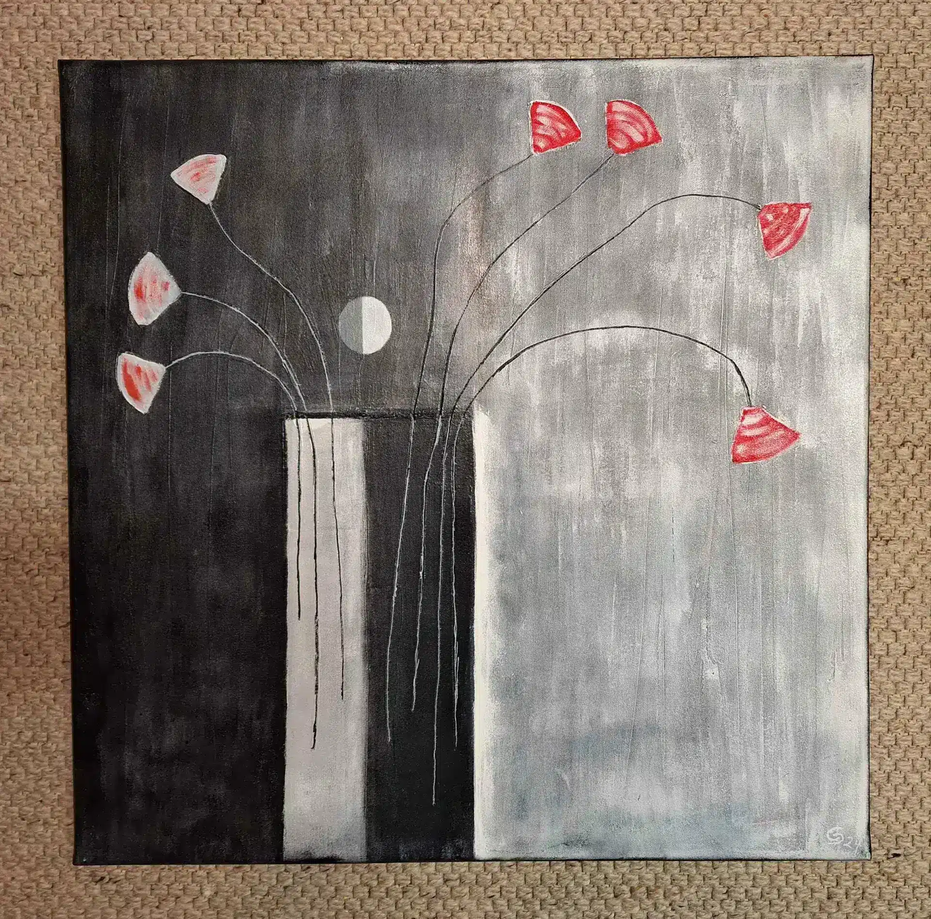 Es ist ein abstraktes Gemälde in Schwarz- Weiß mit roten Akzenten. Auf einer grundierten Leinwand mit einer feinen Struktur und der Rollentechnik in Schwarz und Weiß wurde das Kunstwerk aufgebaut. Es stellt stilisierte Blumen in einer kantigen Vase dar.