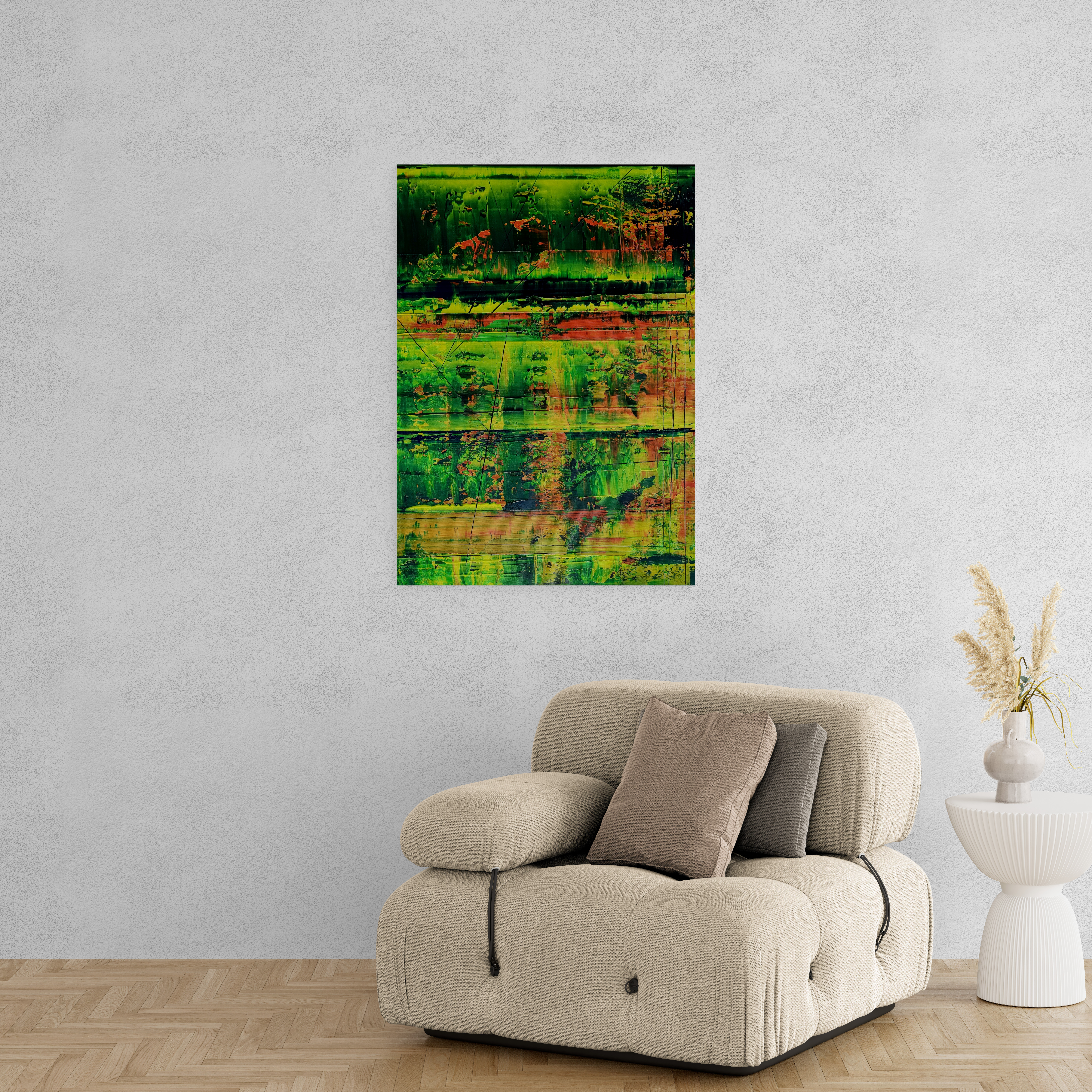 Dieses Werk wirkt leiser – und genau darin liegt seine Kraft. Die Oberfläche scheint Schicht für Schicht etwas freizulegen, ohne es je ganz preiszugeben. Gedämpfte Farbräume, Linien und Unterbrechungen bleiben wie Spuren von etwas, das einmal da war. Ein Bild, das nicht laut werden muss, um präsent zu sein.