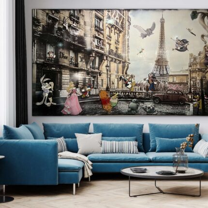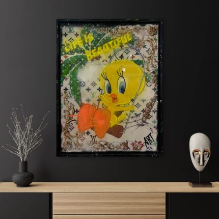 Jedes Bild entsteht in aufwendiger Mischtechnik mit zahlreichen Schichten: Siebdruck, Stencil-Graffiti, digitale Drucktechniken, expressive Acrylmalerei – final versiegelt mit hochglänzendem Kunstharz.